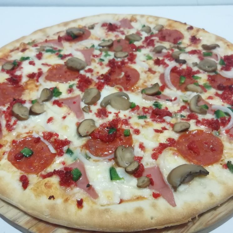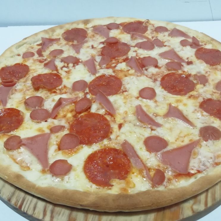 Queso, jamón, pepperoni, chorizo, champiñón, jalapeño y cebolla.