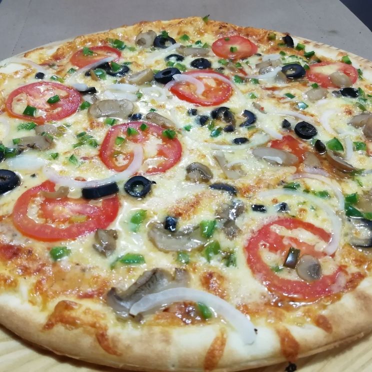 Queso, jitomate, champiñones, aceituna, jalapeño, cebolla.
