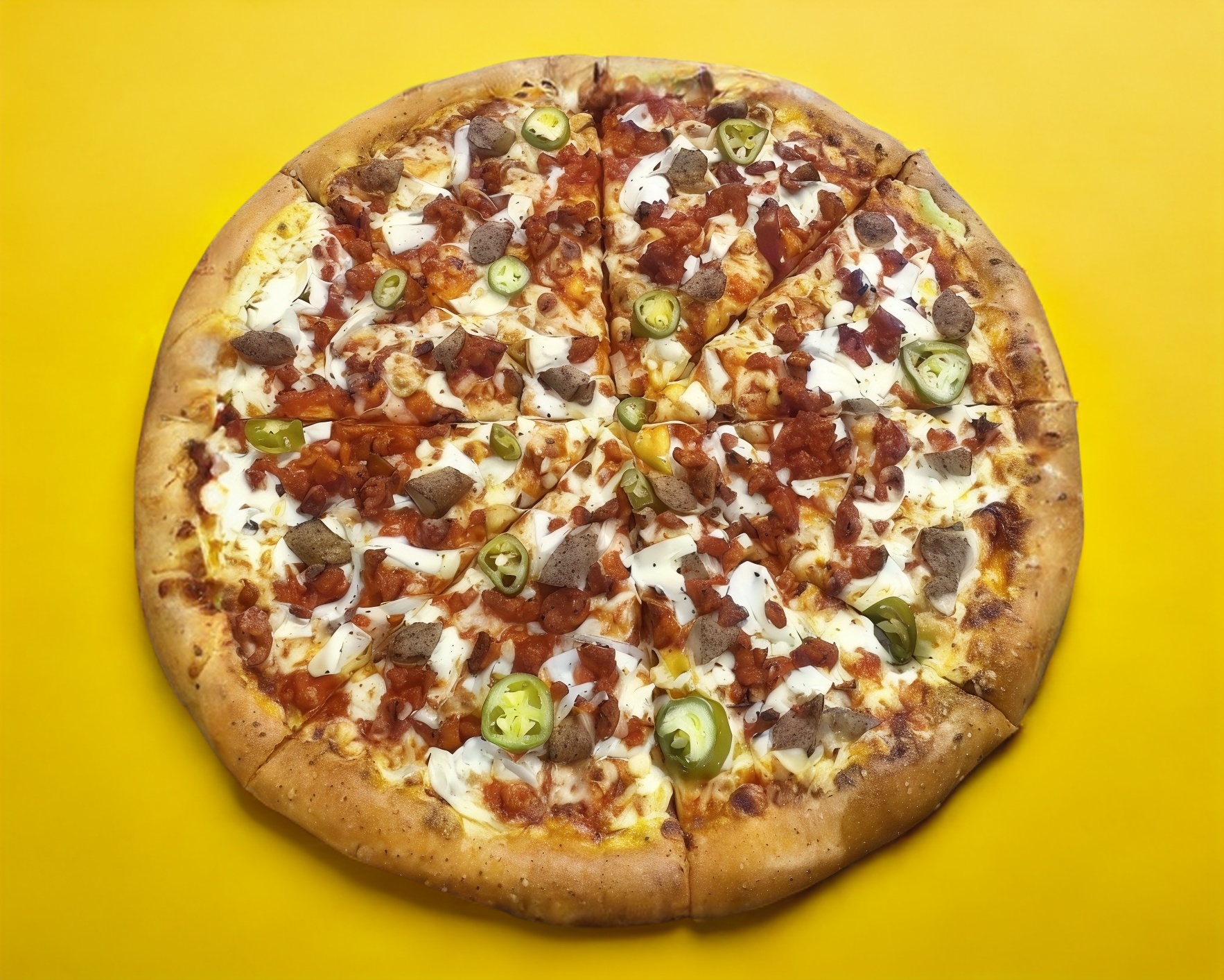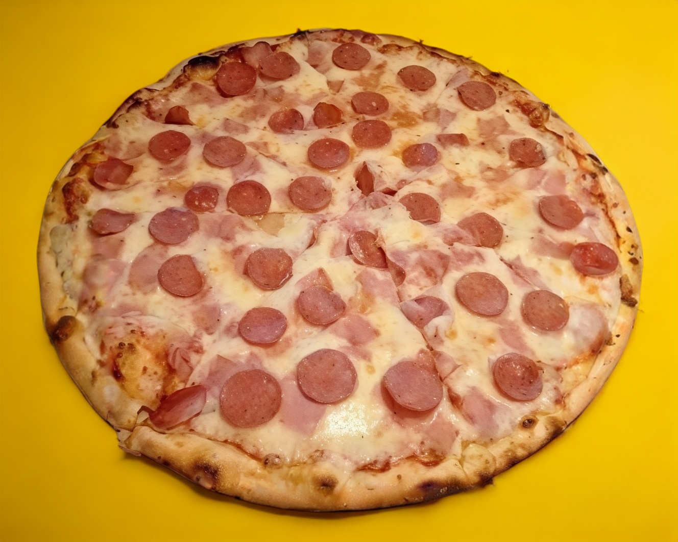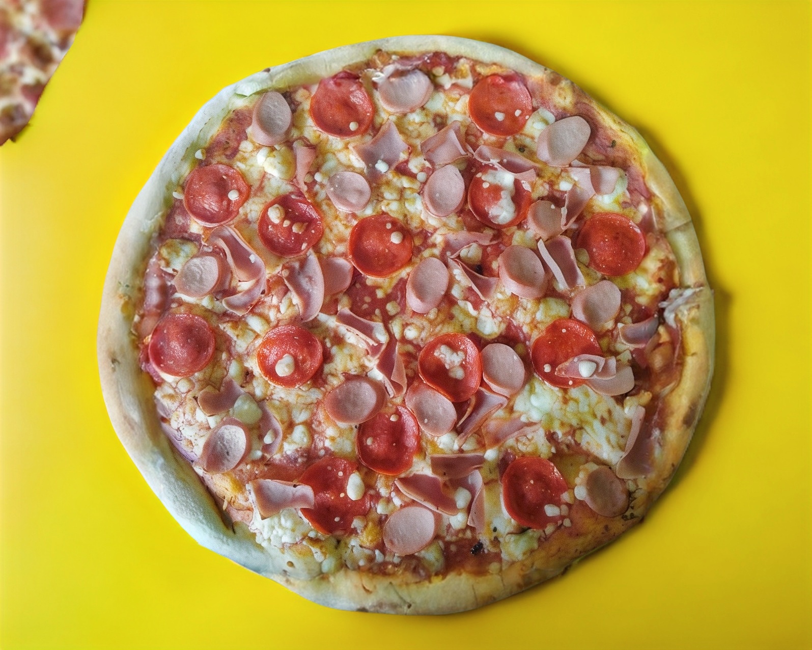 salsa de jitomate, queso mozzarella, peperoni, jamón, salchicha 35 cm 8 rebanadas