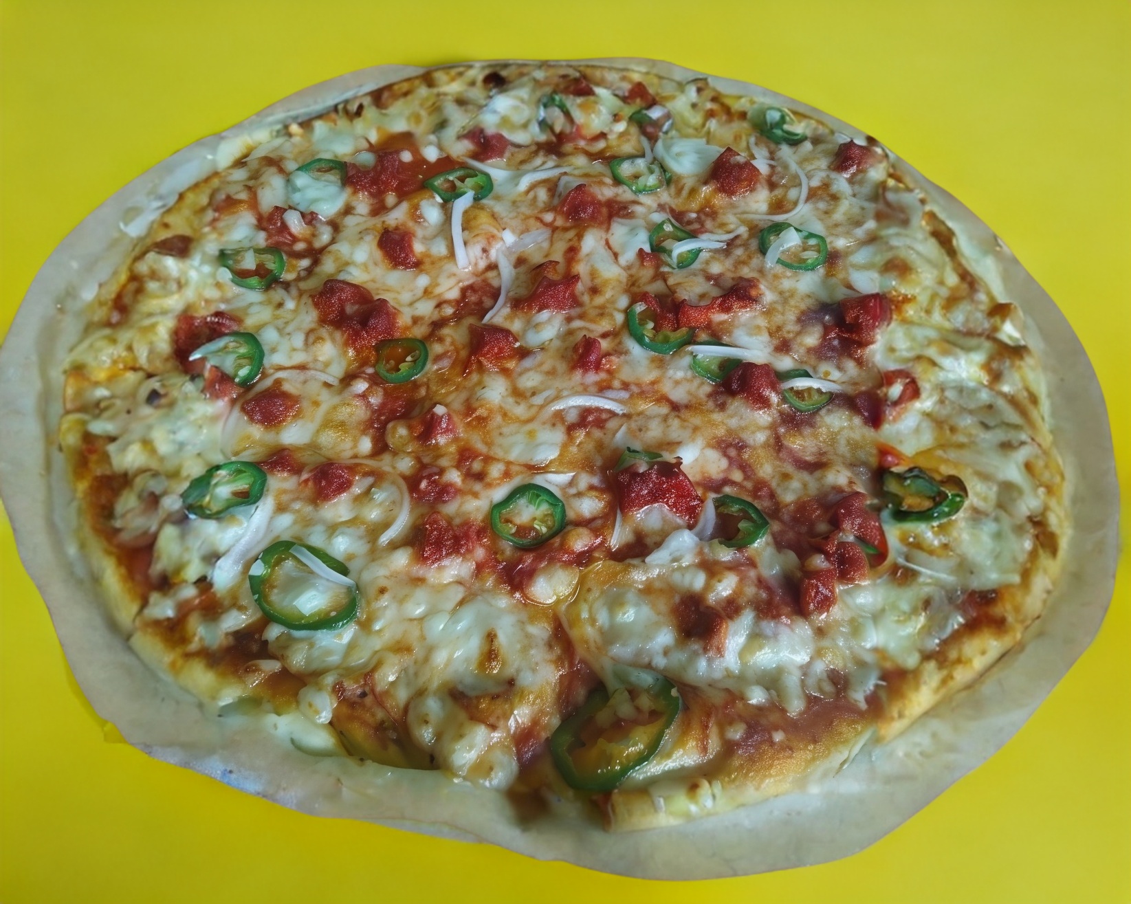 salsa de jitomate, mozzarella, jalapeño,cebolla,chorizo,frijoles 35cm 8 rebanadas