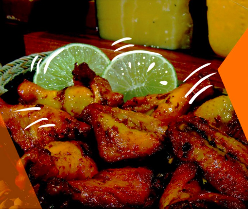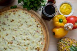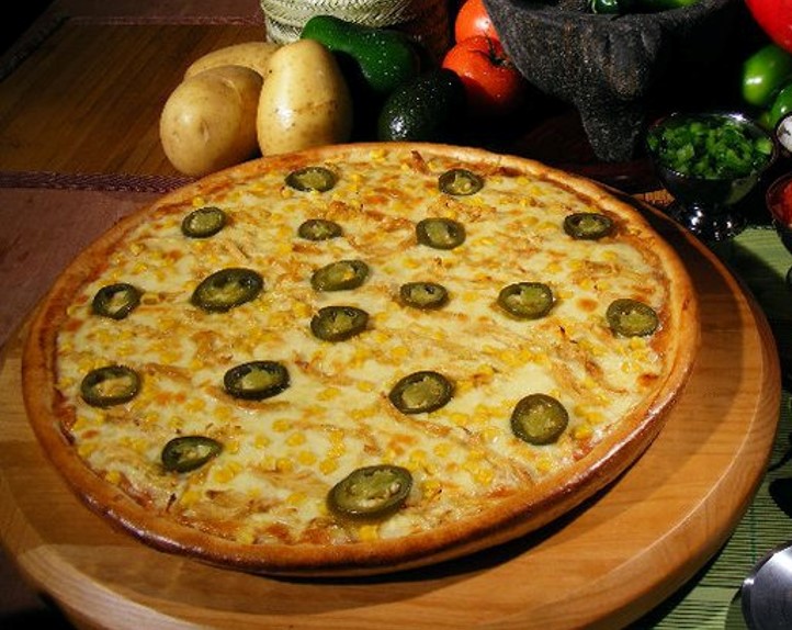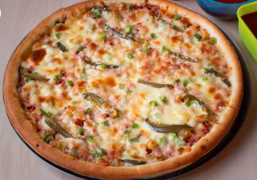 Jamón, tocino, chorizo, piña, pimiento, jalapeño y cebolla.