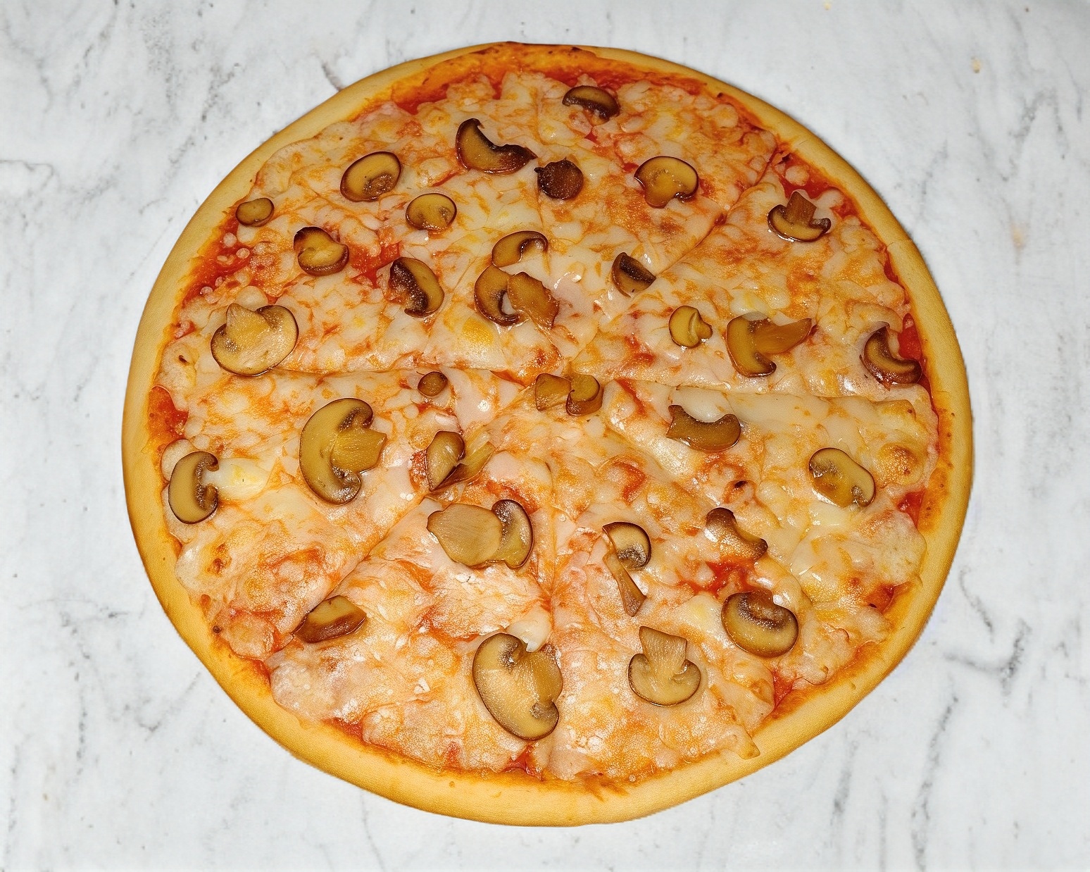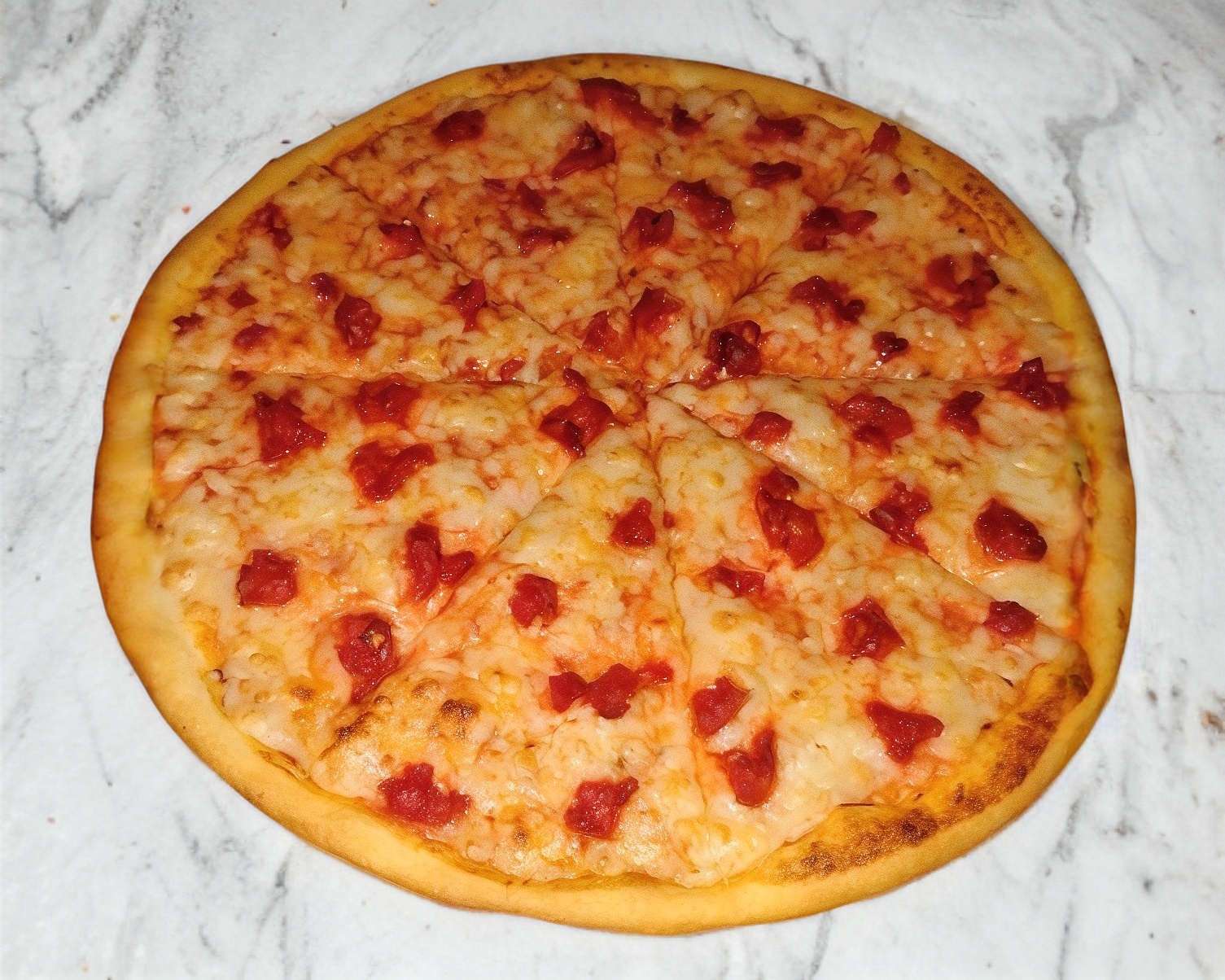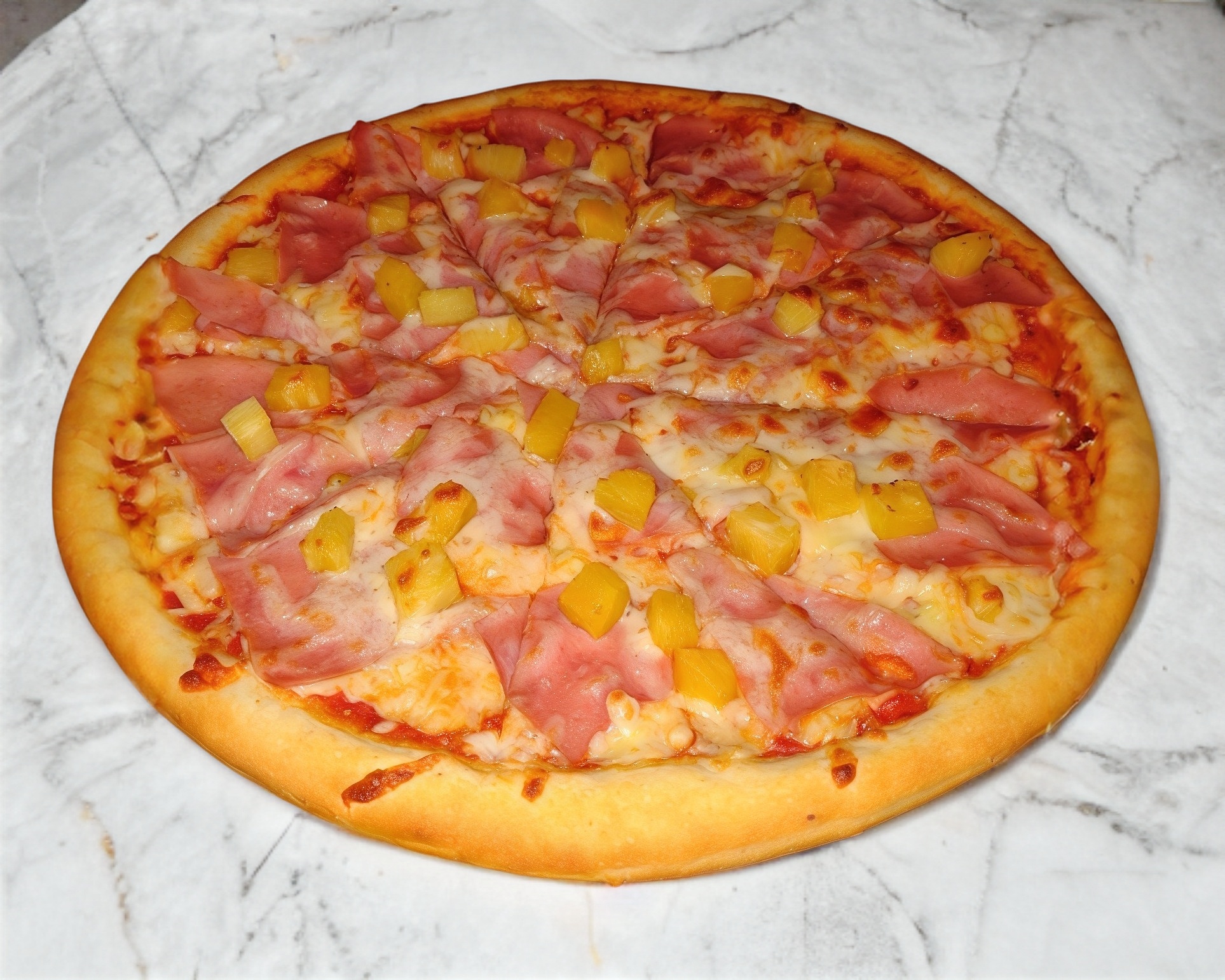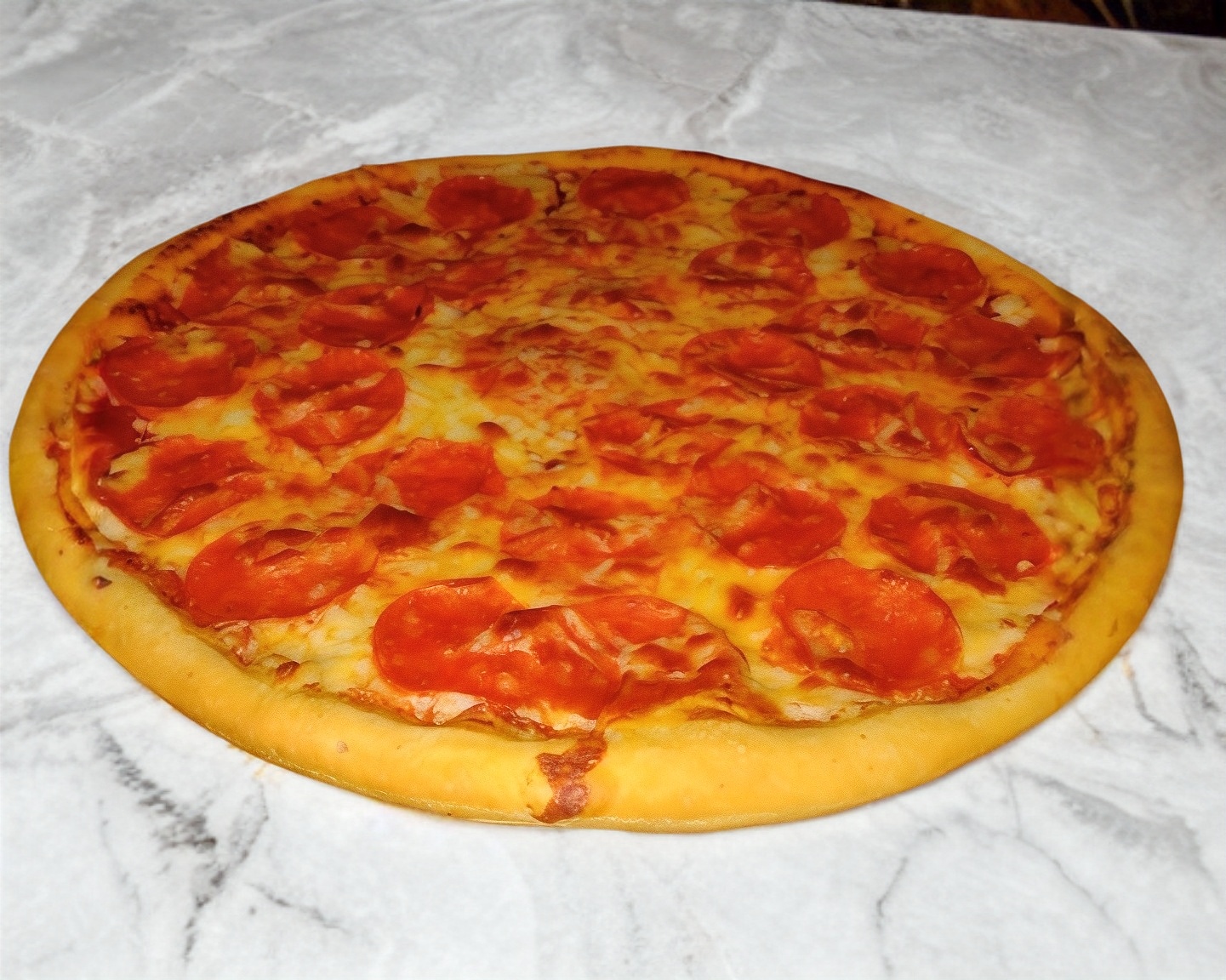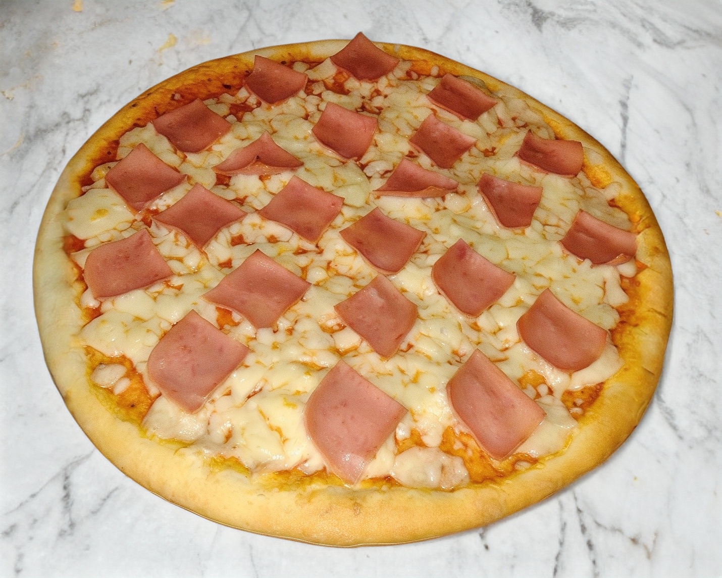 Pizza grande de 33 cm, jamón, salami, pepperoni salchicha, tocino.