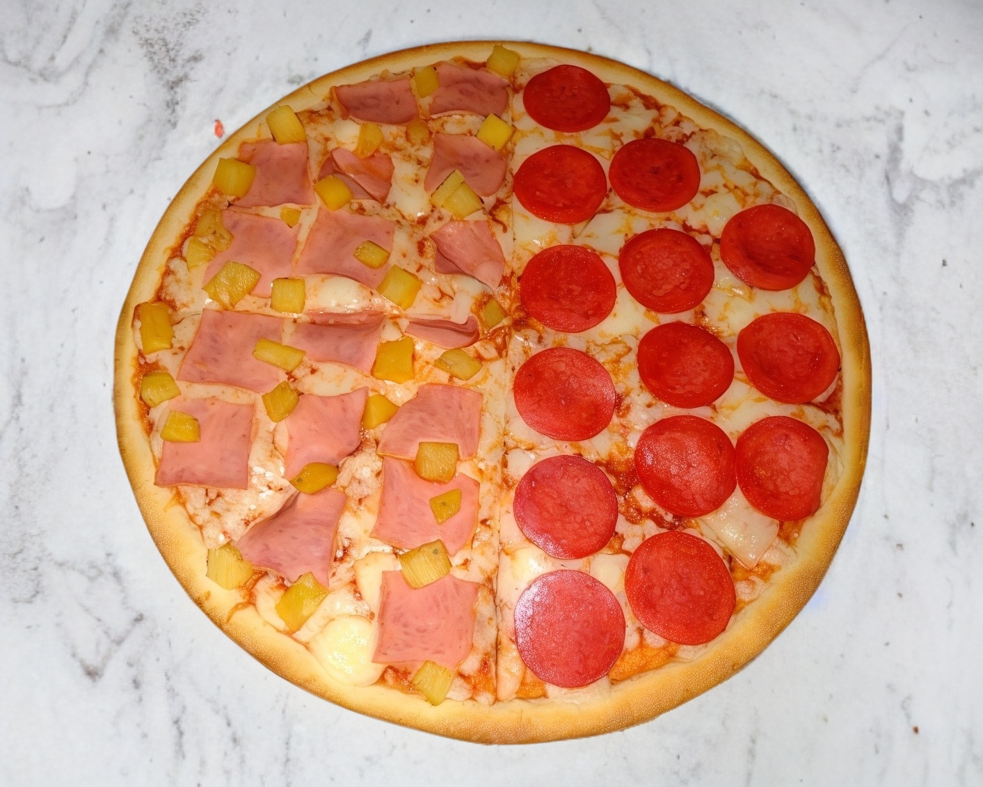 Pizza grande de 33cm - Mitad Hawaiana Mitad Peperoni