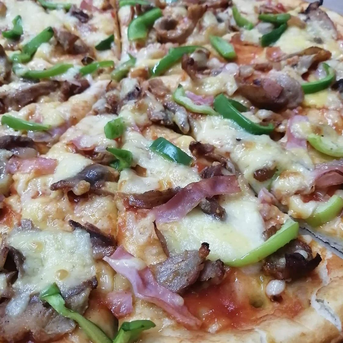 Salsa italiana, cebolla, tocino, champiñones, jamon, salchicha, y pimiento morrom