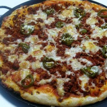 SALSA DE TOMATE, QUESO MOZZARELLA, QUESO GOUDA, LONGANIZA, FRIJOLES, CHILES JALAPEÑOS, ORILLA RELLENA DE QUESO