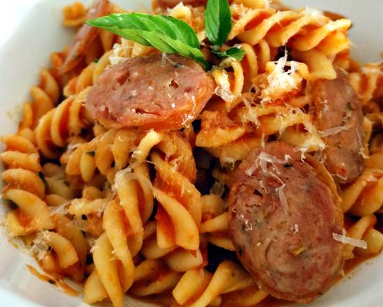 Pasta con salsa Marinara (a base de tomate), Chorizo argentino, Parmesano y Albahaca.