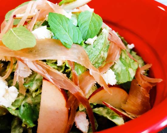 Deliciosa ensalada con ingredientes de lujo… Mezcla de lechugas, Jamón serrano, Manzana, Queso de Cabra, Menta, Aderezo de Yoghurt.