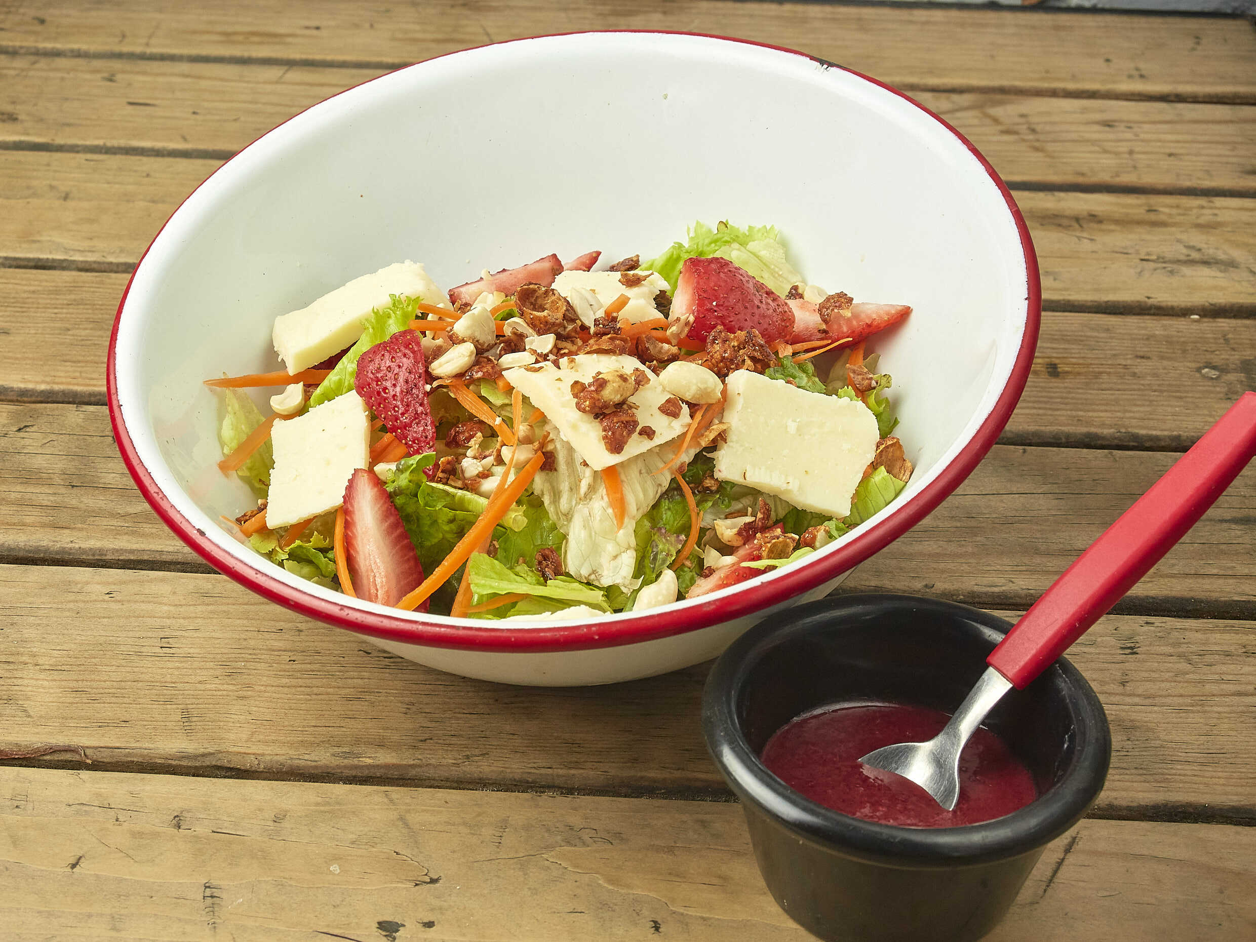 Nuestra clásica ensalada dulce con… Mezcla de lechugas, Fresas, Queso mozzarella, Cacahuate garapiñado, Vinagreta de frutos rojos.