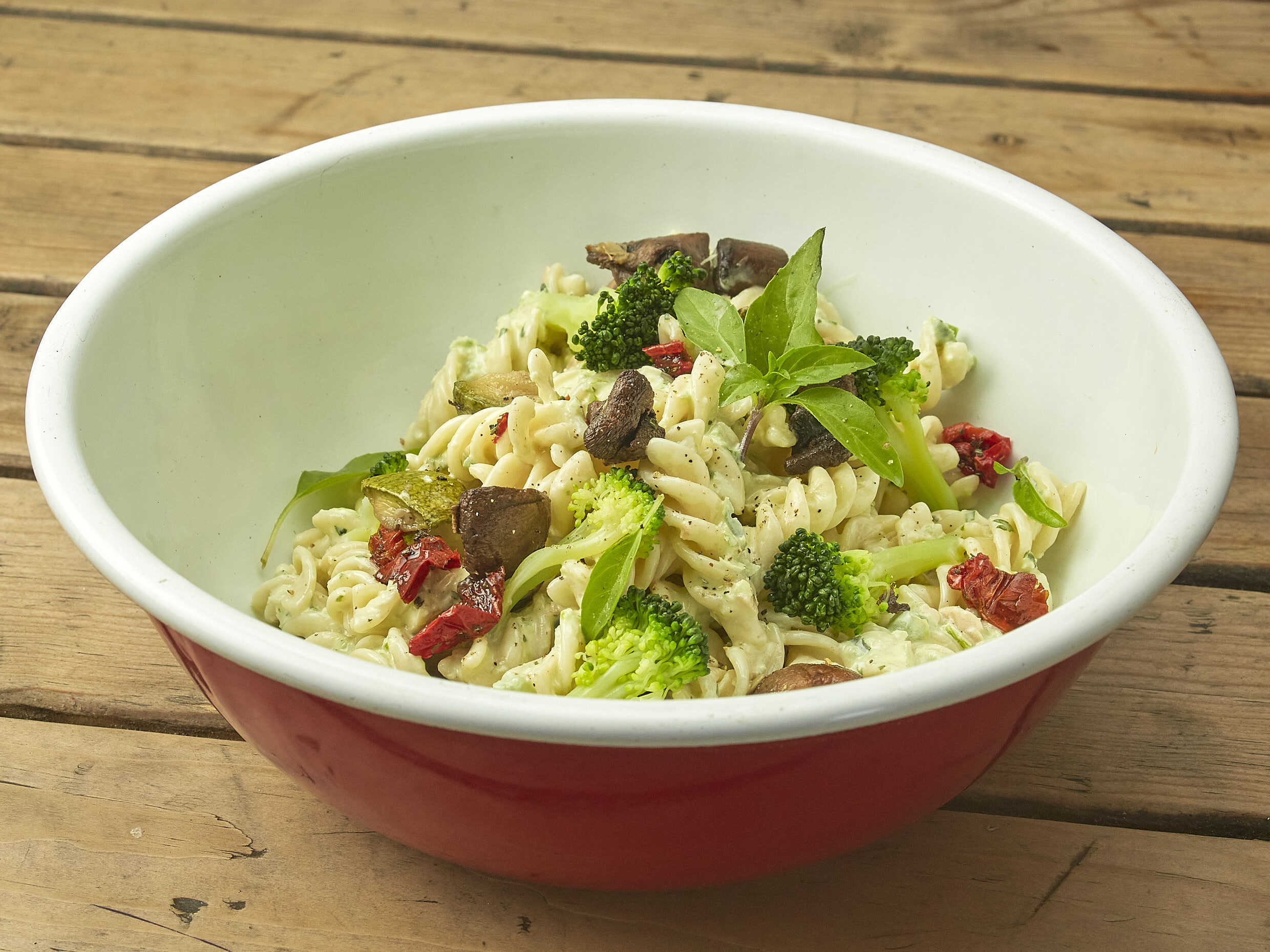 Cremoso fusilli (pasta en forma de tornillo) con crema de pesto de jalapeño, pollo, queso mozzarella, vegetales salteados.