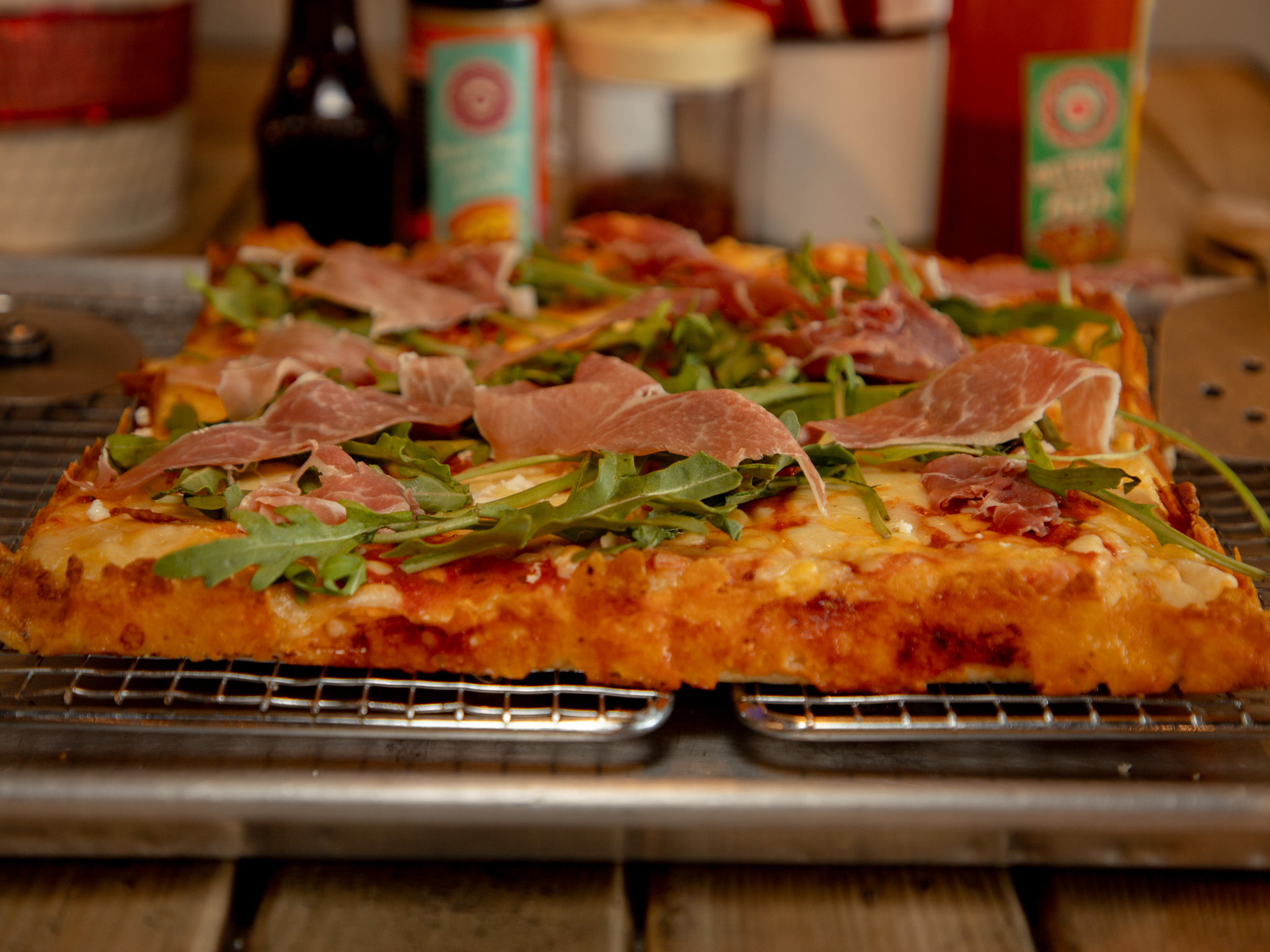 Jamón serrano, Parmesano, Arúgula, Aceite de Ajo