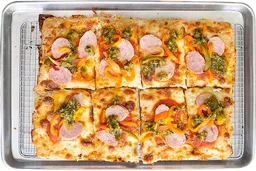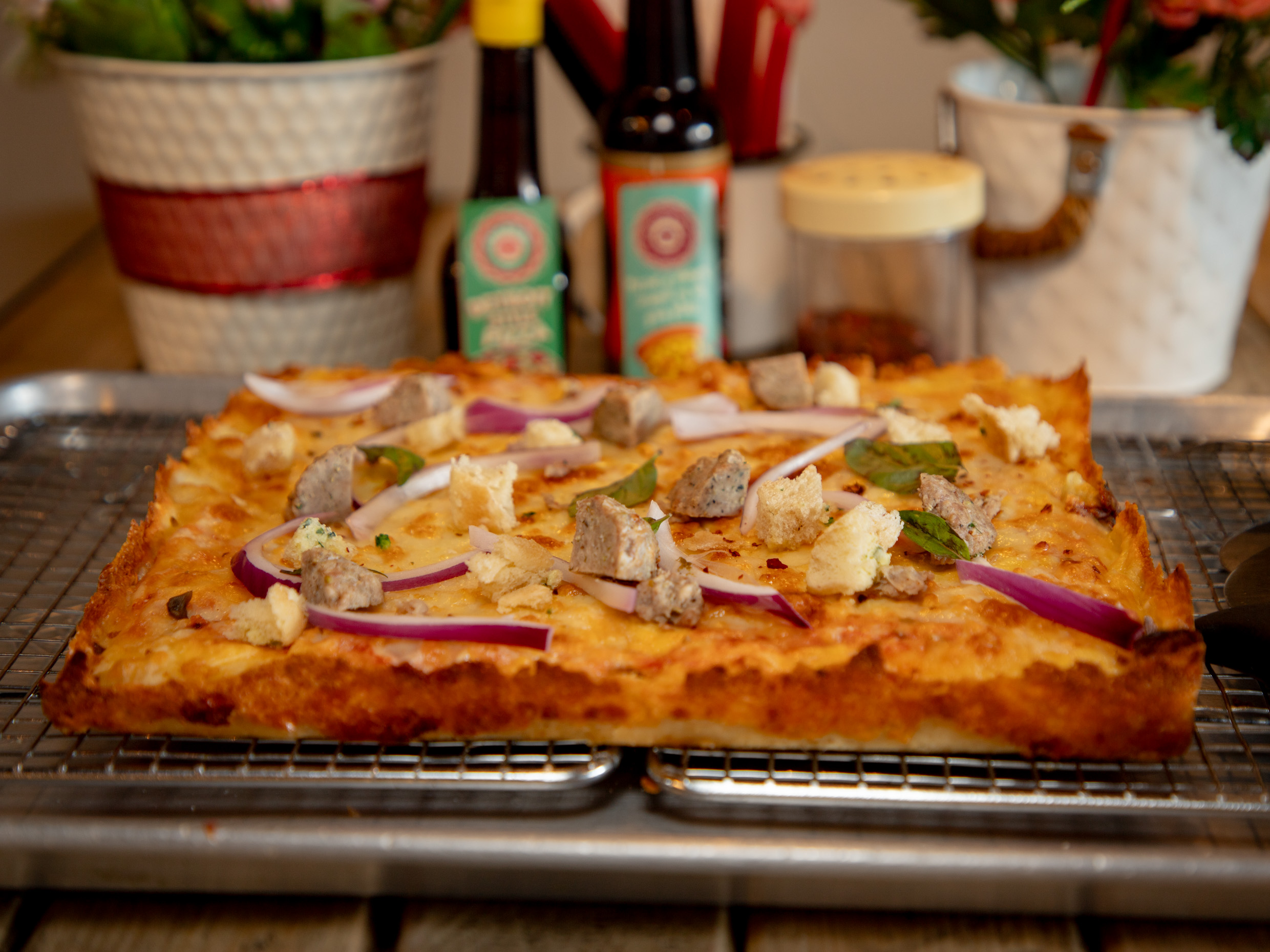 Salchicha italiana de la casa, Cebolla morada, Albahaca, Parmesano, Crotones, Peperoncino