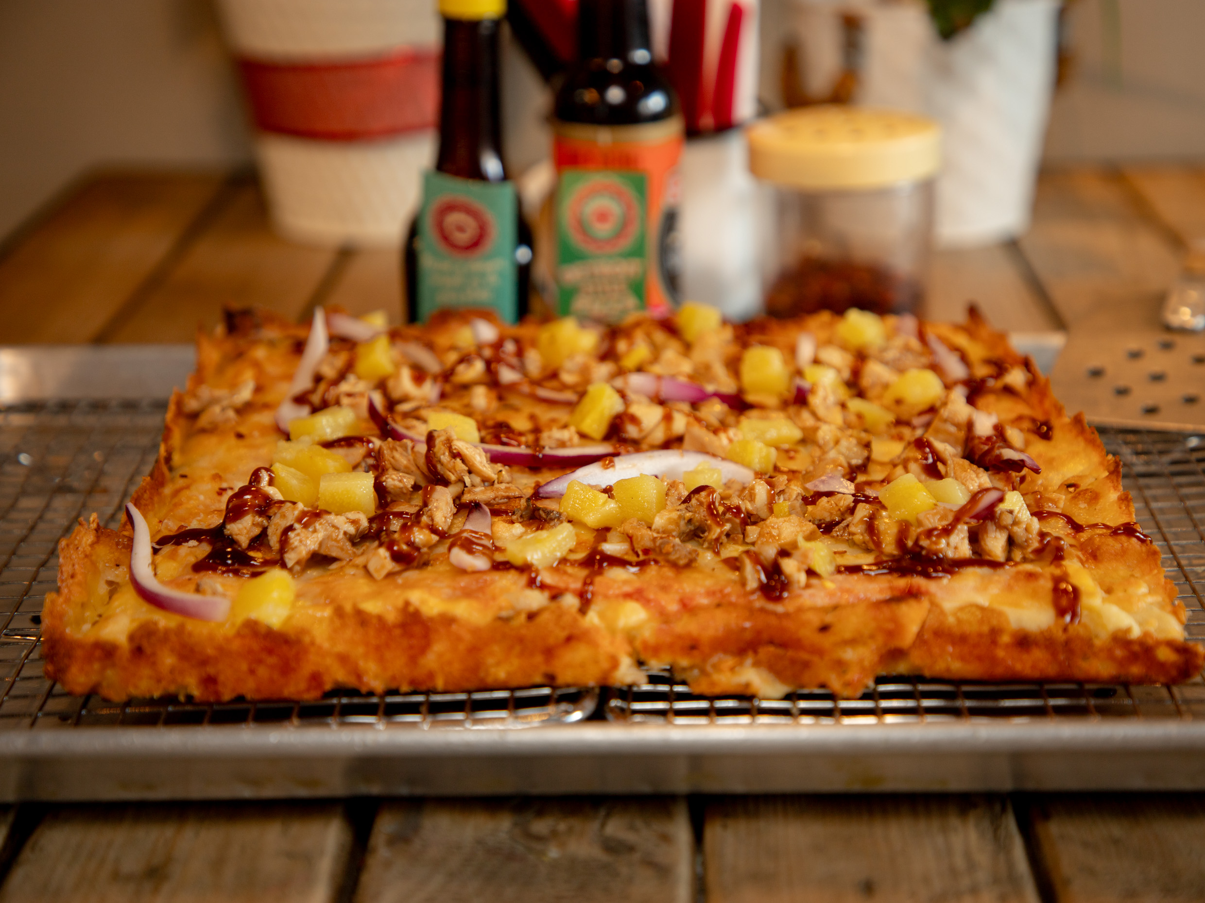 Pollo marinado en salsa BBQ, Piña, Cebolla morada