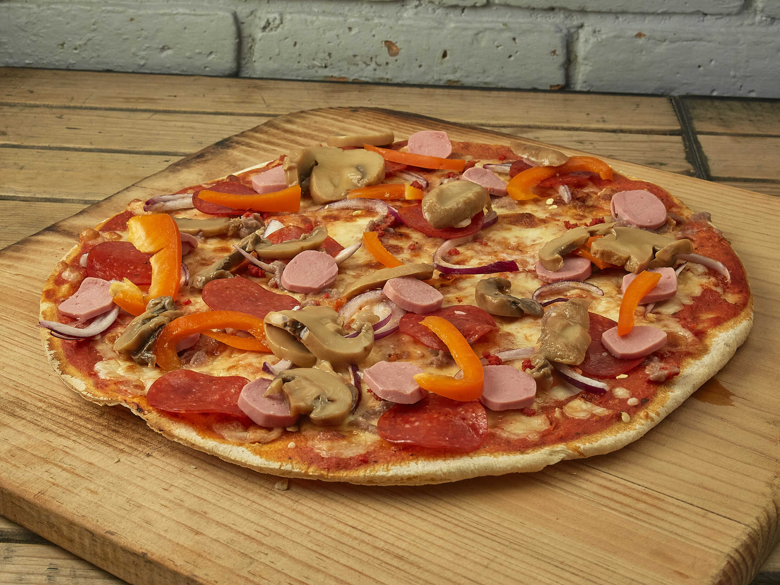 Pepperoni, Salchicha, Pimiento, Champiñón, Cebolla morada