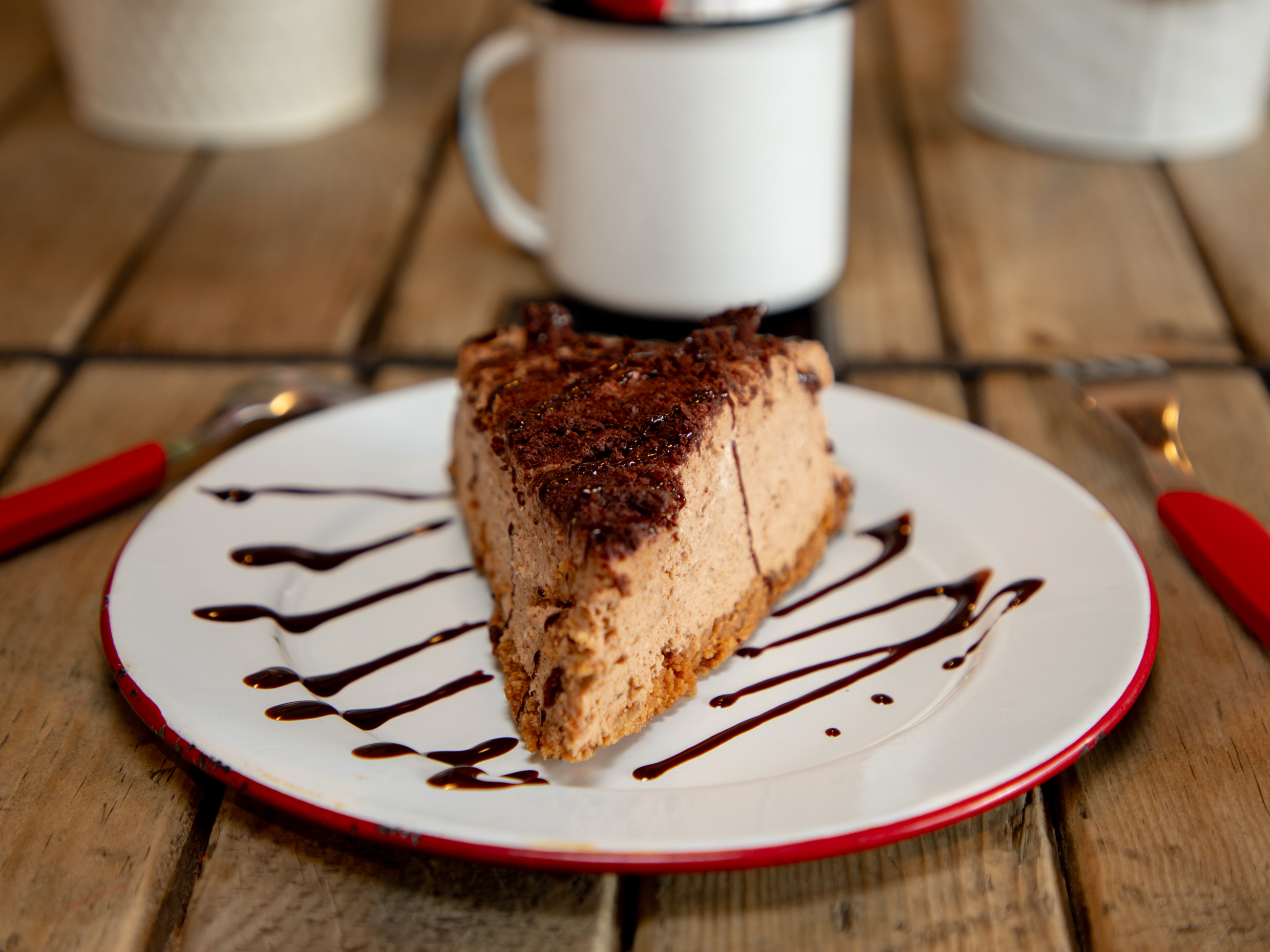 Nuestro cremoso cheesecake, una base de galletas canelitas, de ganache de chocolate y trozos de chocolate abuelita.