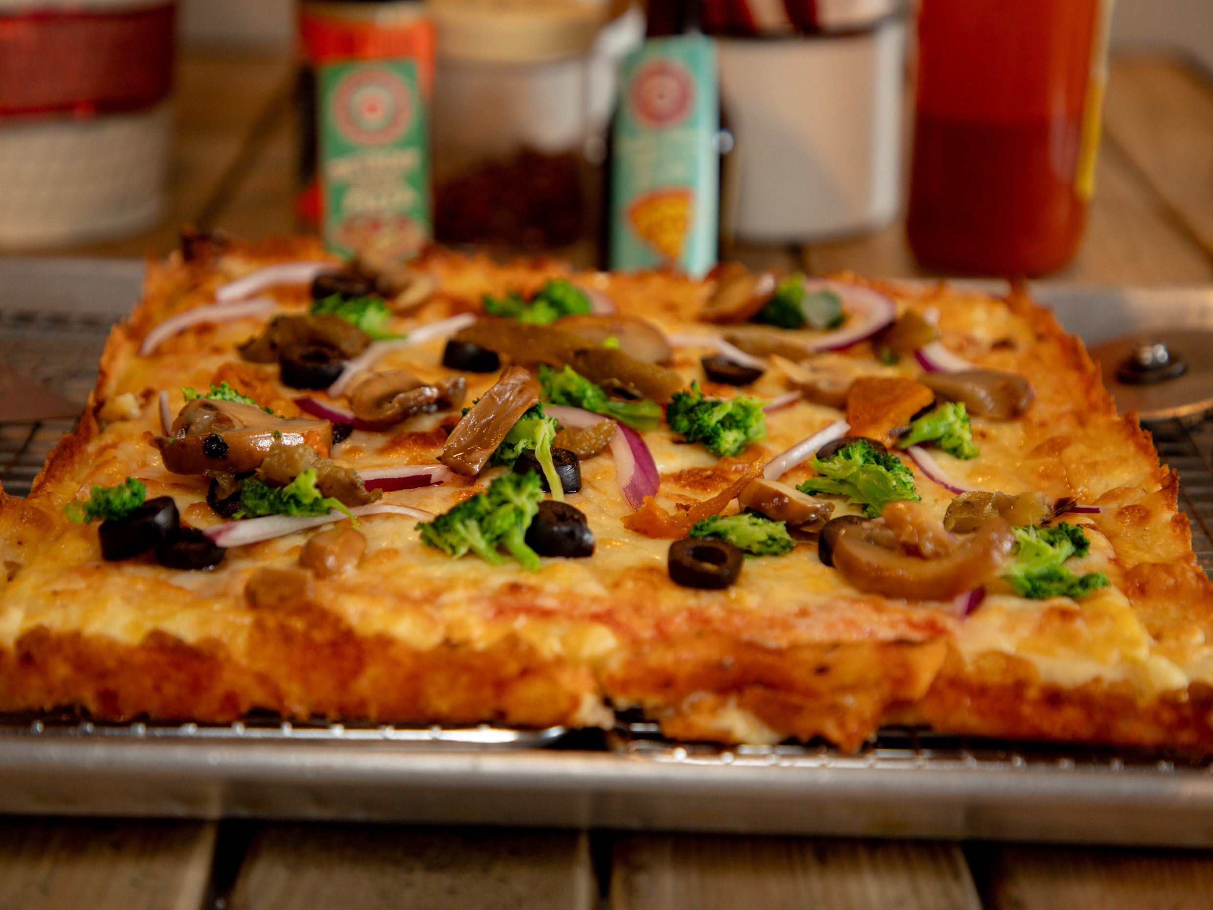 Champiñón, Cebolla, Pimiento rostizado en horno de leña, Aceituna negra
