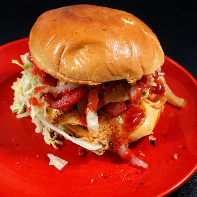 Salchicha frita, tocino crocante, cebolla caramelizada, jitomate y aderezos.