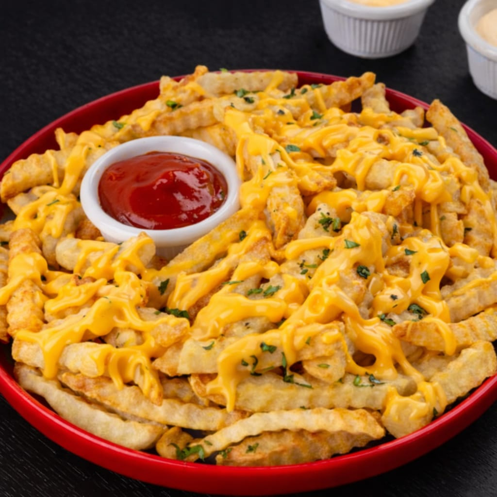 Orden de papas fritas acompañadas de aderezos y queso.