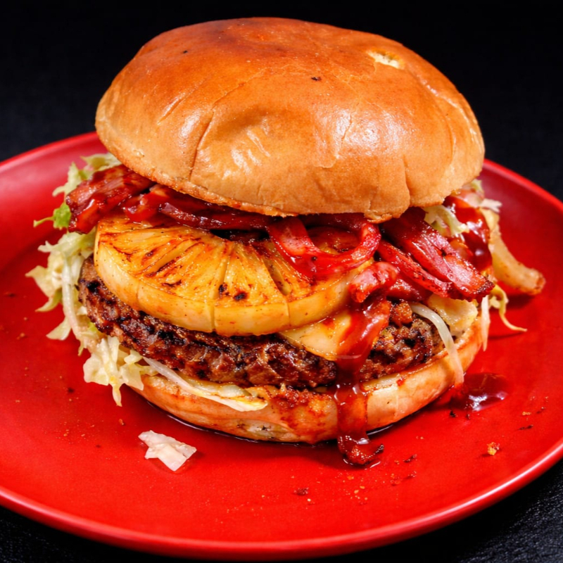 Suculenta carne, acompañada de queso Americano, quesillo, piña, jamon, cebolla caramelizada, jitomate, lechuga y aderezos.