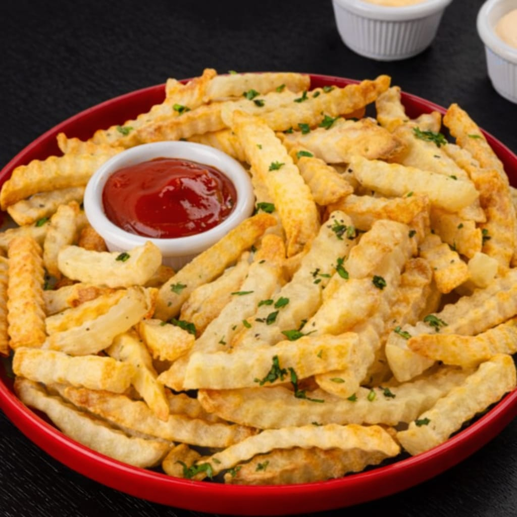 Orden de papas fritas con aderezos.