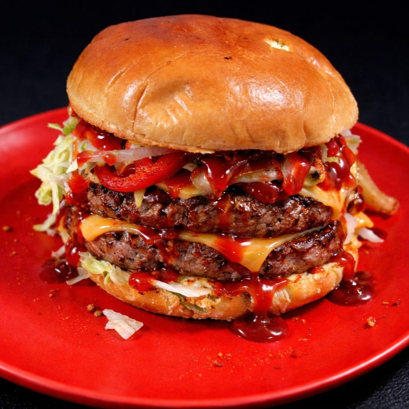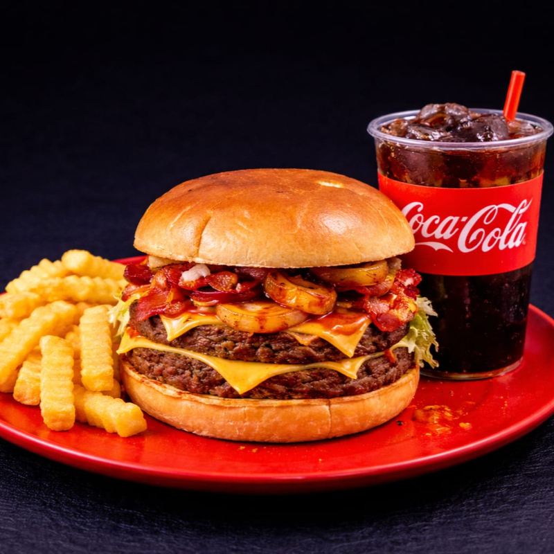 Doble carne acompañada de queso americano, quesillo tocino crocante, jamon, cabolla caramelizada, jitomate, lechuga y aderezos.