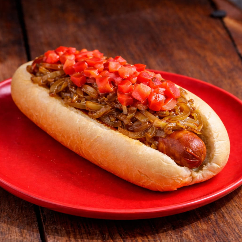 Salchicha frita, jitomate, cebolla caramelizada y aderezos