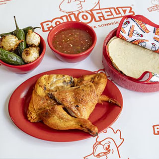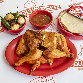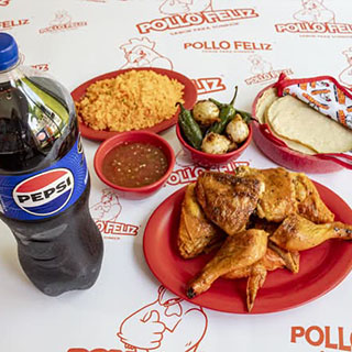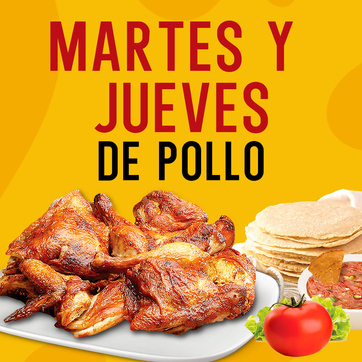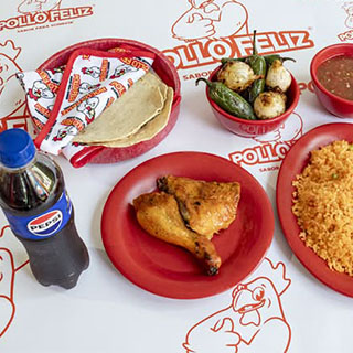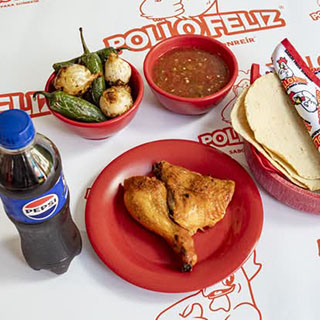 1 pollo (8 piezas). Incluye: 8 tortillas, salsa, chiles y cebollas. 1 Refresco familiar más 1 Complemento a elegir.