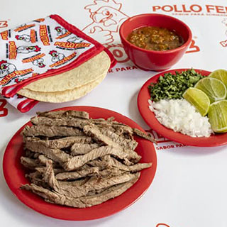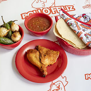 1 pollo (8 piezas). Incluye: 8 tortillas, salsa, chiles y cebollas.