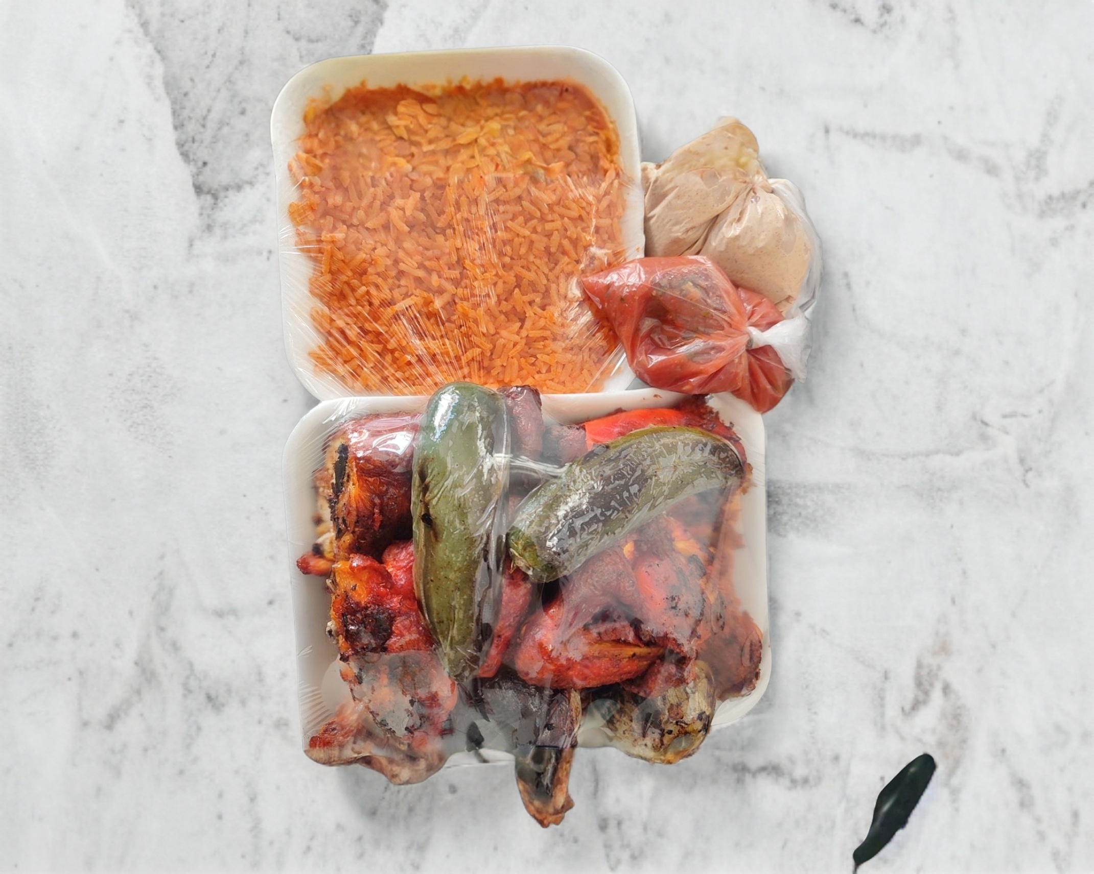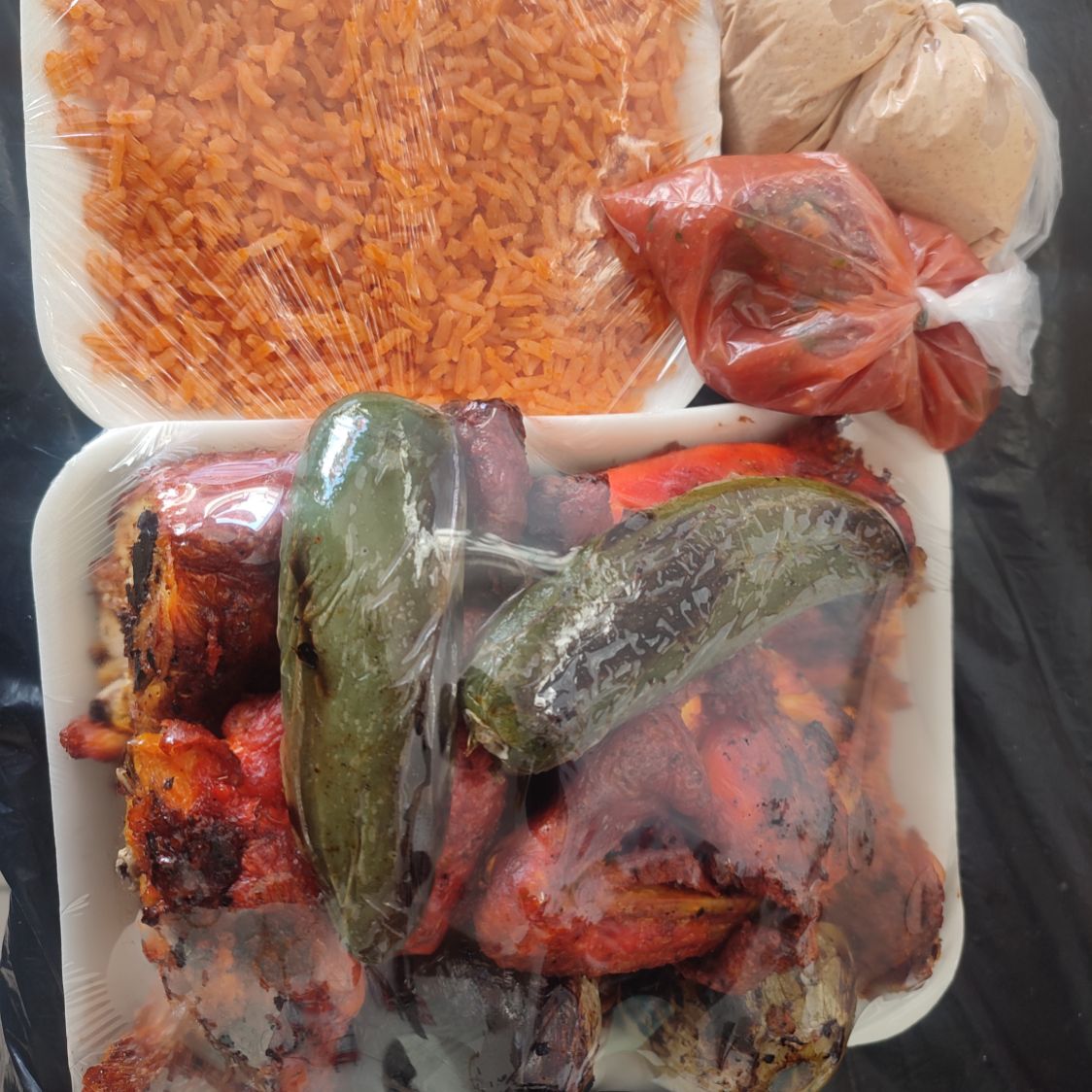 1/2 Pollo asado, chiles, cebolla, salsas, 1 porción de arroz.