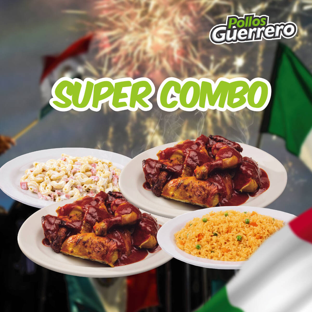 1 Pollo Ranchero + un sabor a elegir 3 guarniciones a elegir de 350g cada una,+ 1/2kg de tortillas + 1 refresco familiar