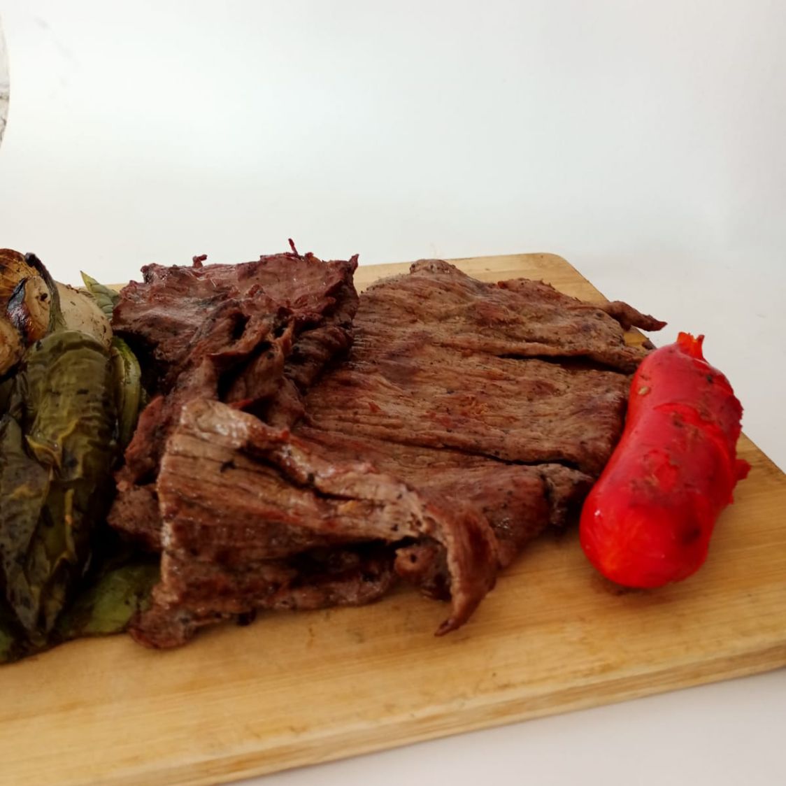 1/2 kg de carne asada** acompañada con 1 salchichón, una orden de nopales (2 pzs), cebollitas asadas (3 pzs), chile asado (3 pzs) y salsa verde.