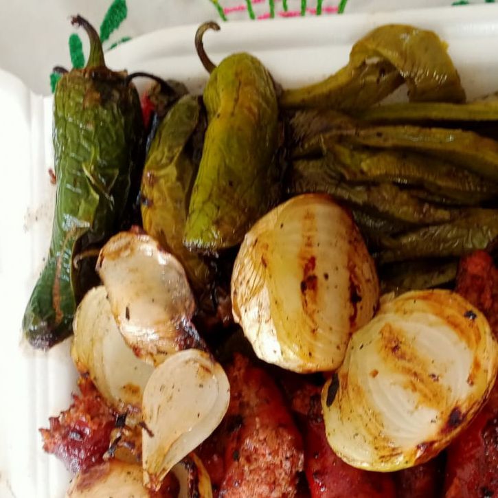 1/2 kg de longaniza** asada acompañada con una orden de nopales (2 pzs), cebollitas asadas (3 pzs), chile asado (3 pzs) y salsa verde.