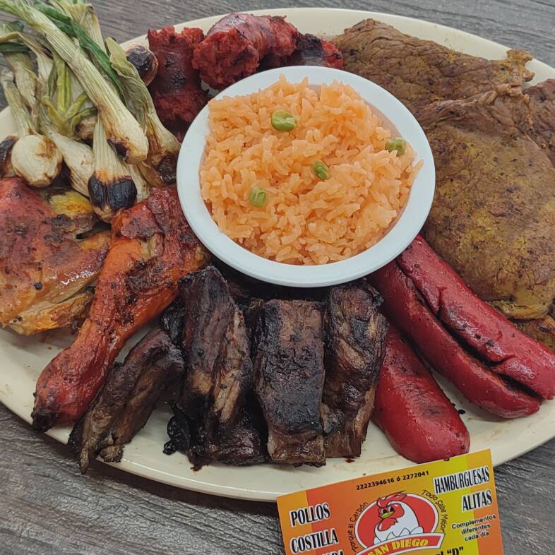 Parrillada para dos personas, incluye carne asada de res, pollo, costilla, salchicha asadera, longaniza, salsa y cebollas.