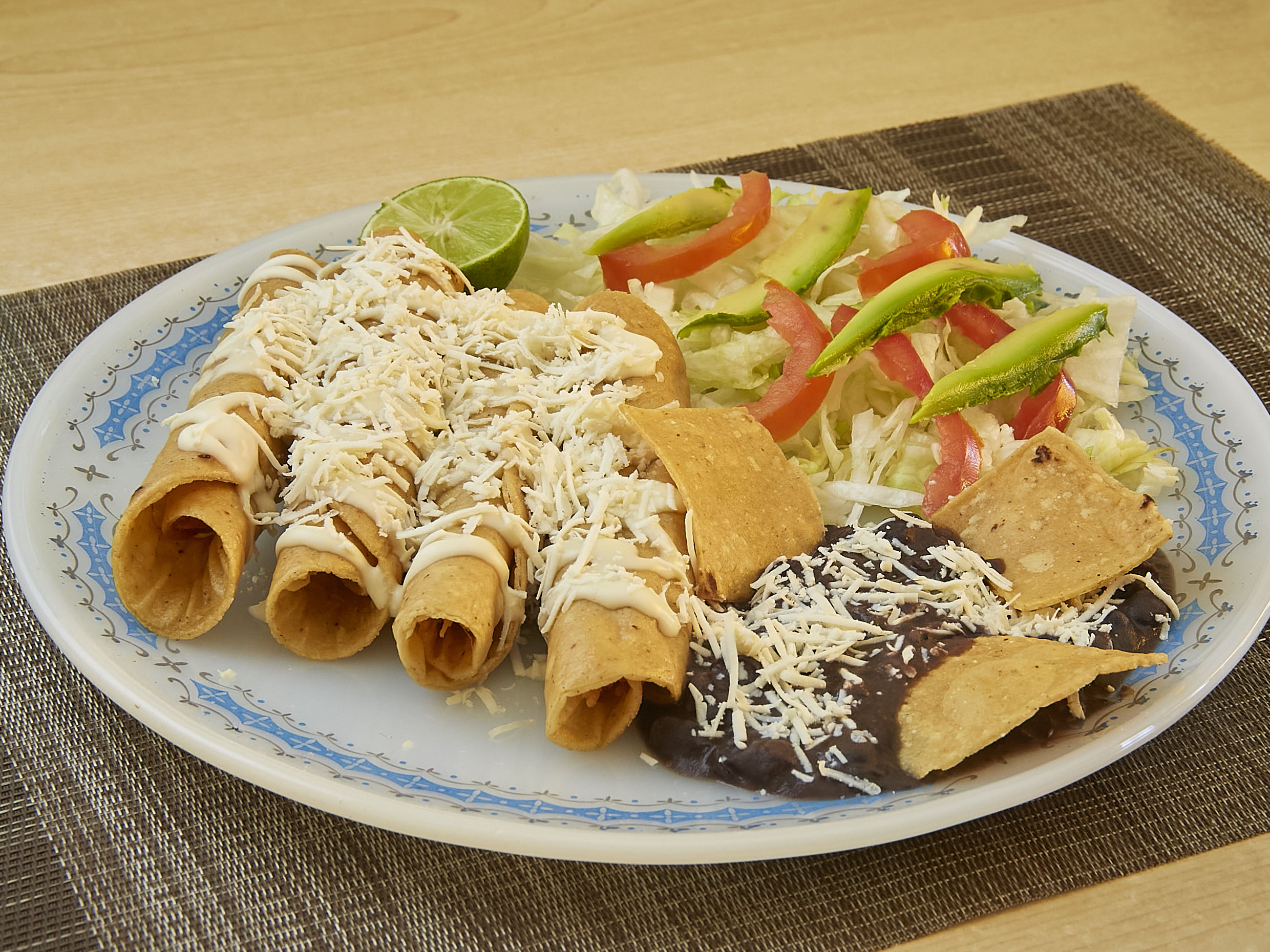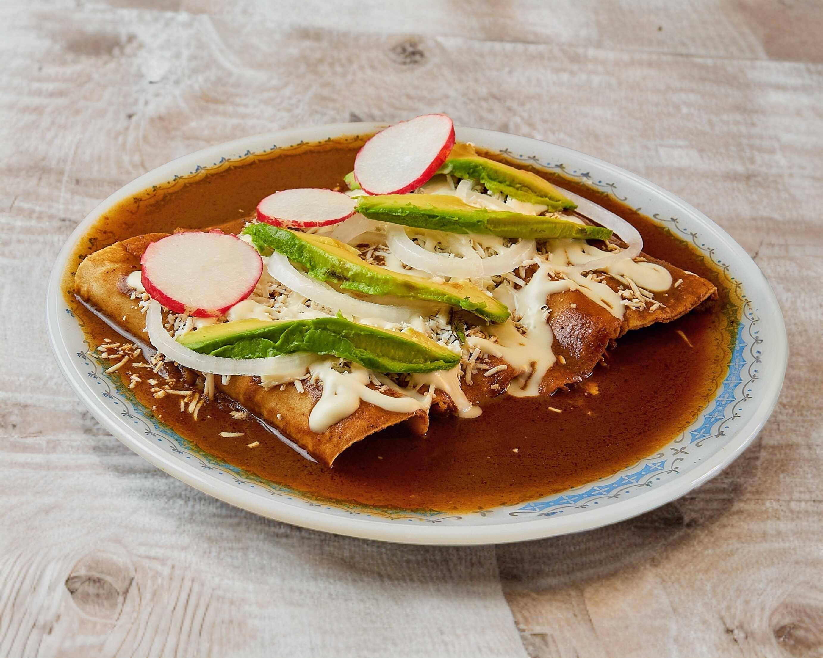 4 Tortillas de maíz de (9) ligeramente doradas rellenas de pollo deshebrado, bañadas en nuestro tradicional mole poblano. Acompañado con crema, queso, cebolla y aguacate.