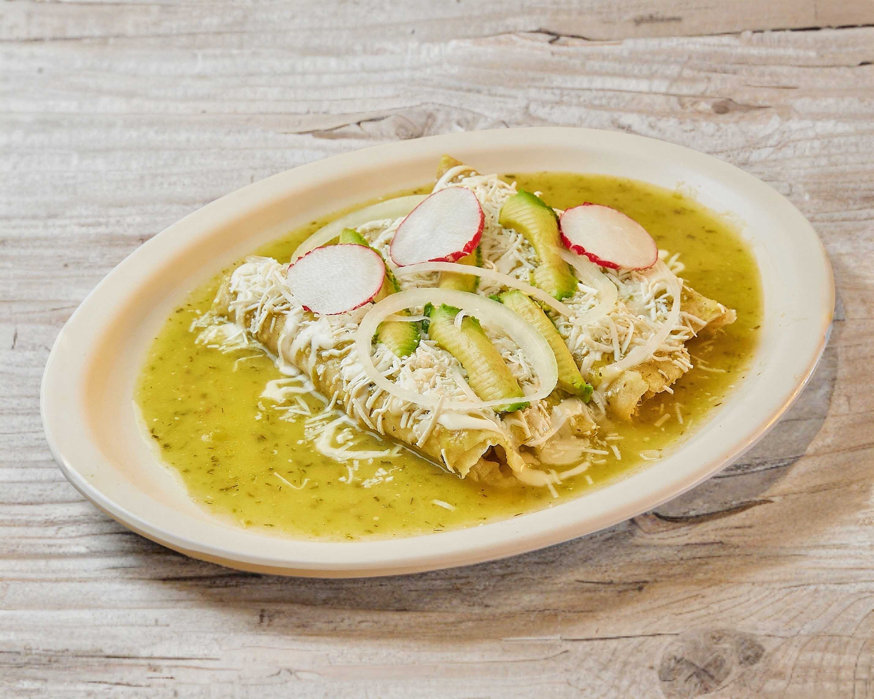 4 Tortillas ligeramente doradas rellenas de pollo deshebrado, bañadas en una rica salsa verde. Acompañado con crema, queso, cebolla y aguacate.
