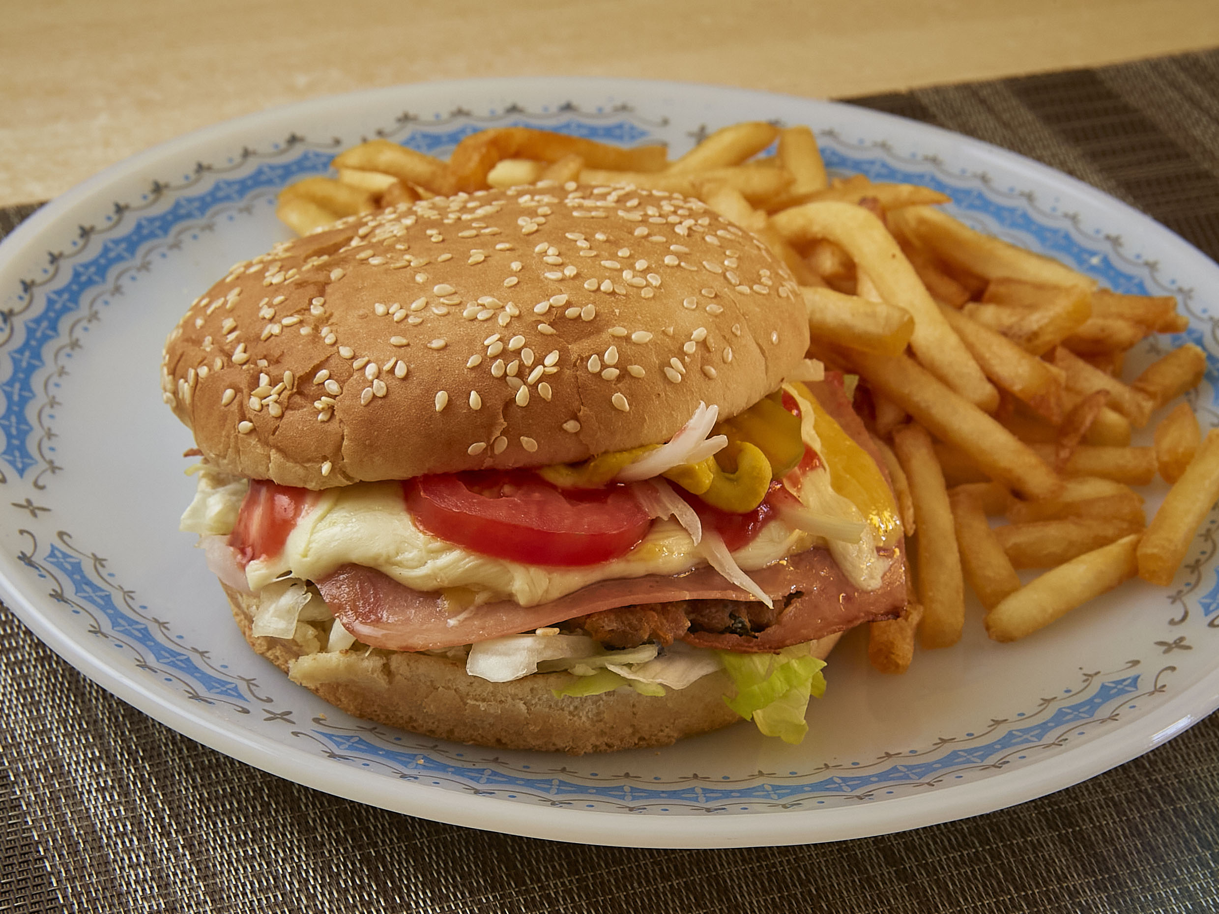 Queso amarillo, quesillo, jitomate, cebolla, lechuga, pepinillos, tocino y piña.