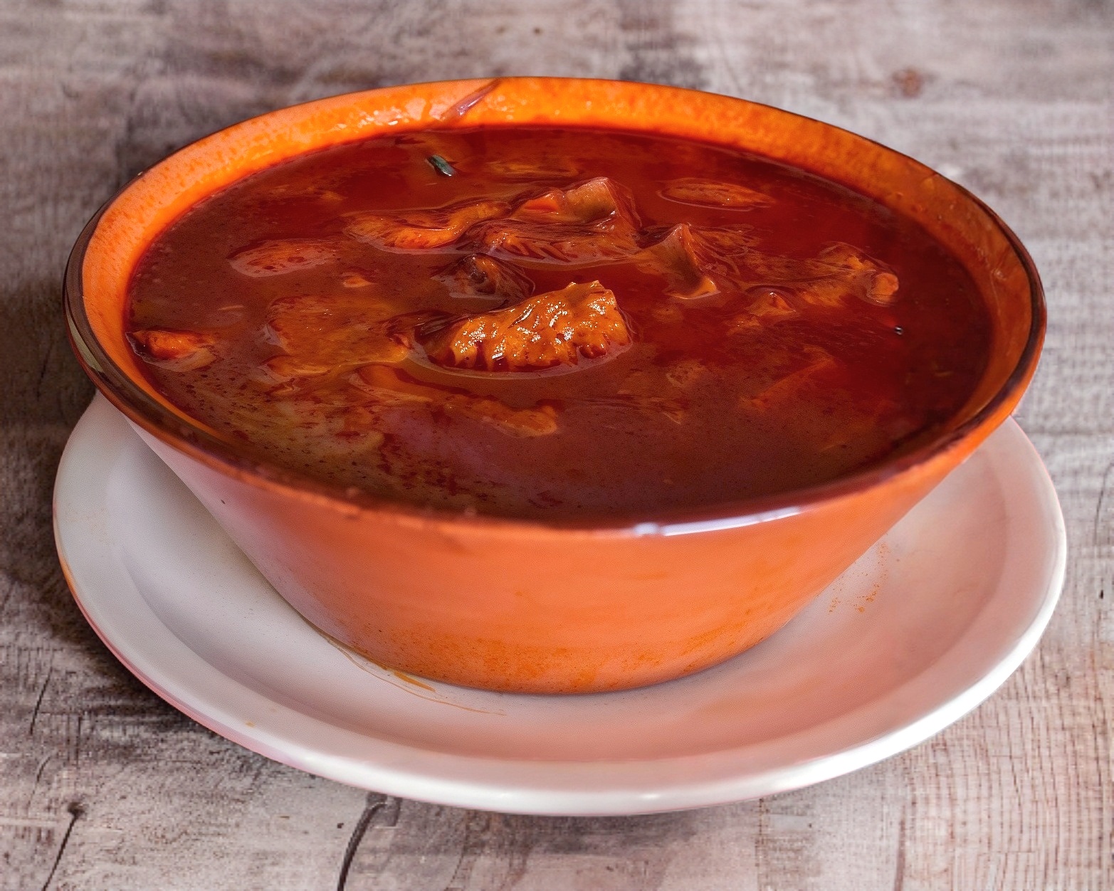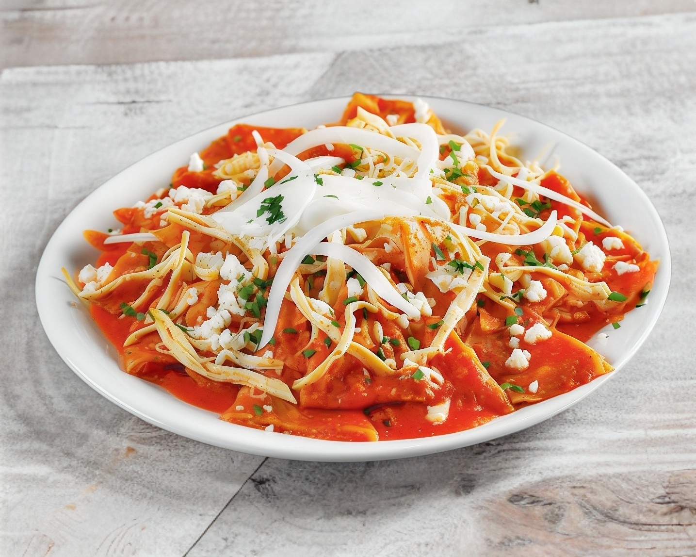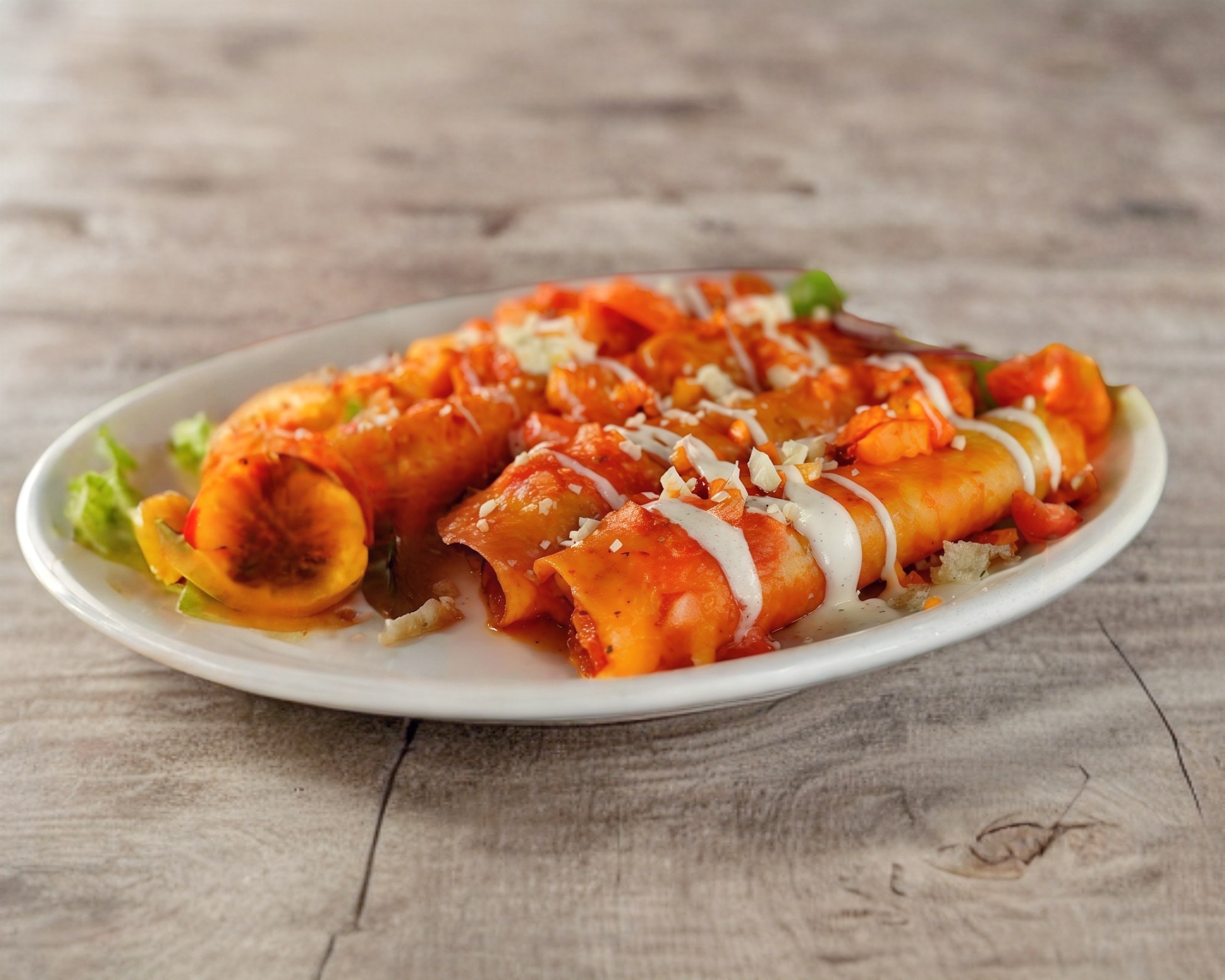 4 Tortillas ligeramente doradas rellenas de pollo deshebrado, bañadas en una rica salsa roja. Acompañado con crema, queso, cebolla y aguacate.