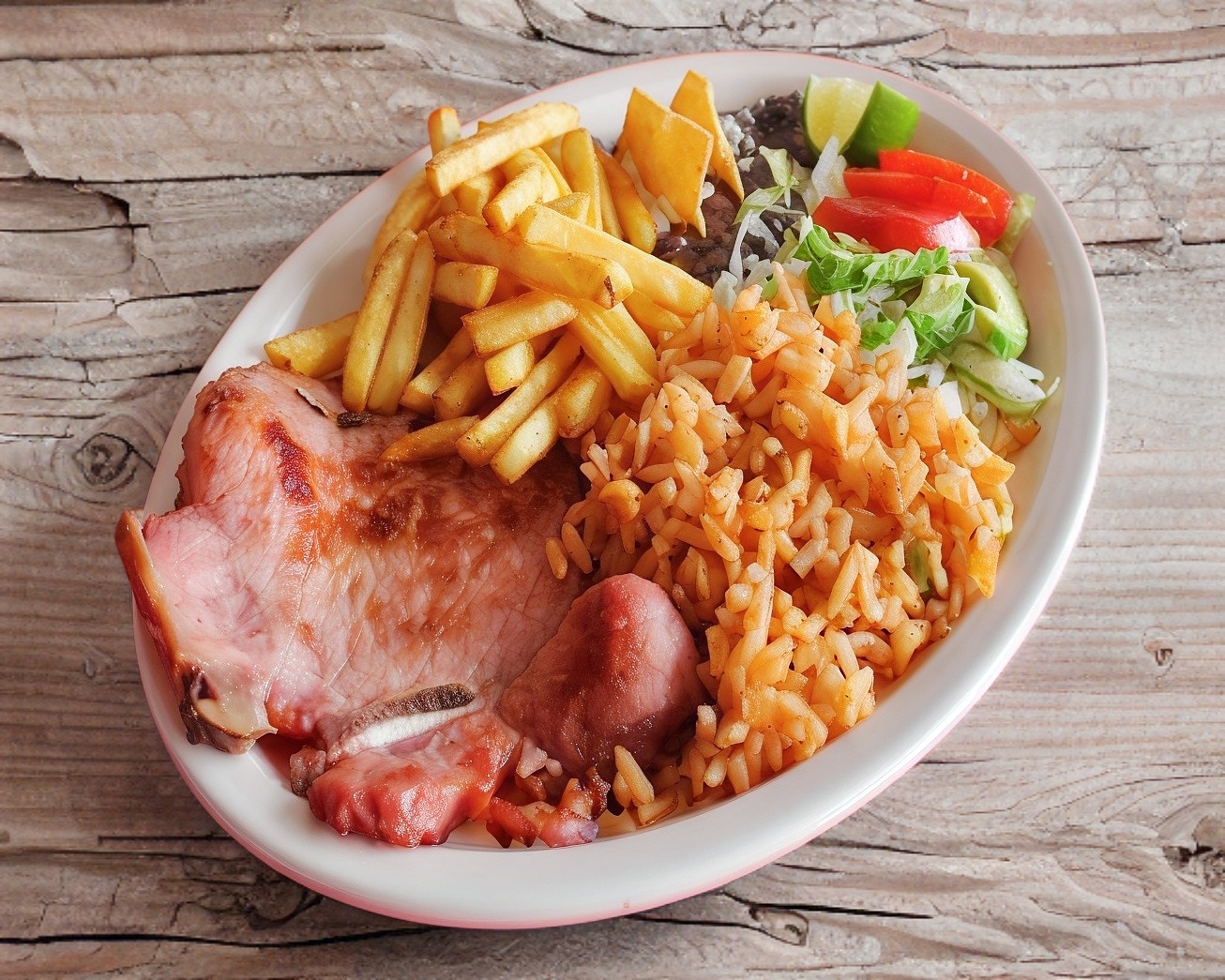 Acompañada de Arroz*1 + Ensalada*1 + Papas y Frijoles Refritos.*1