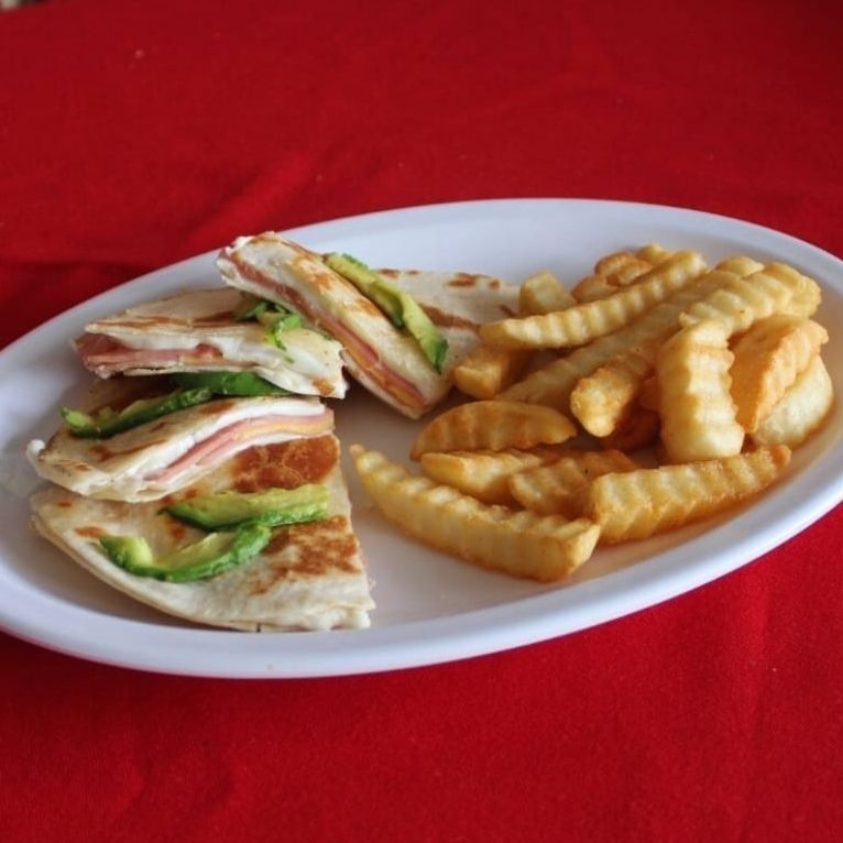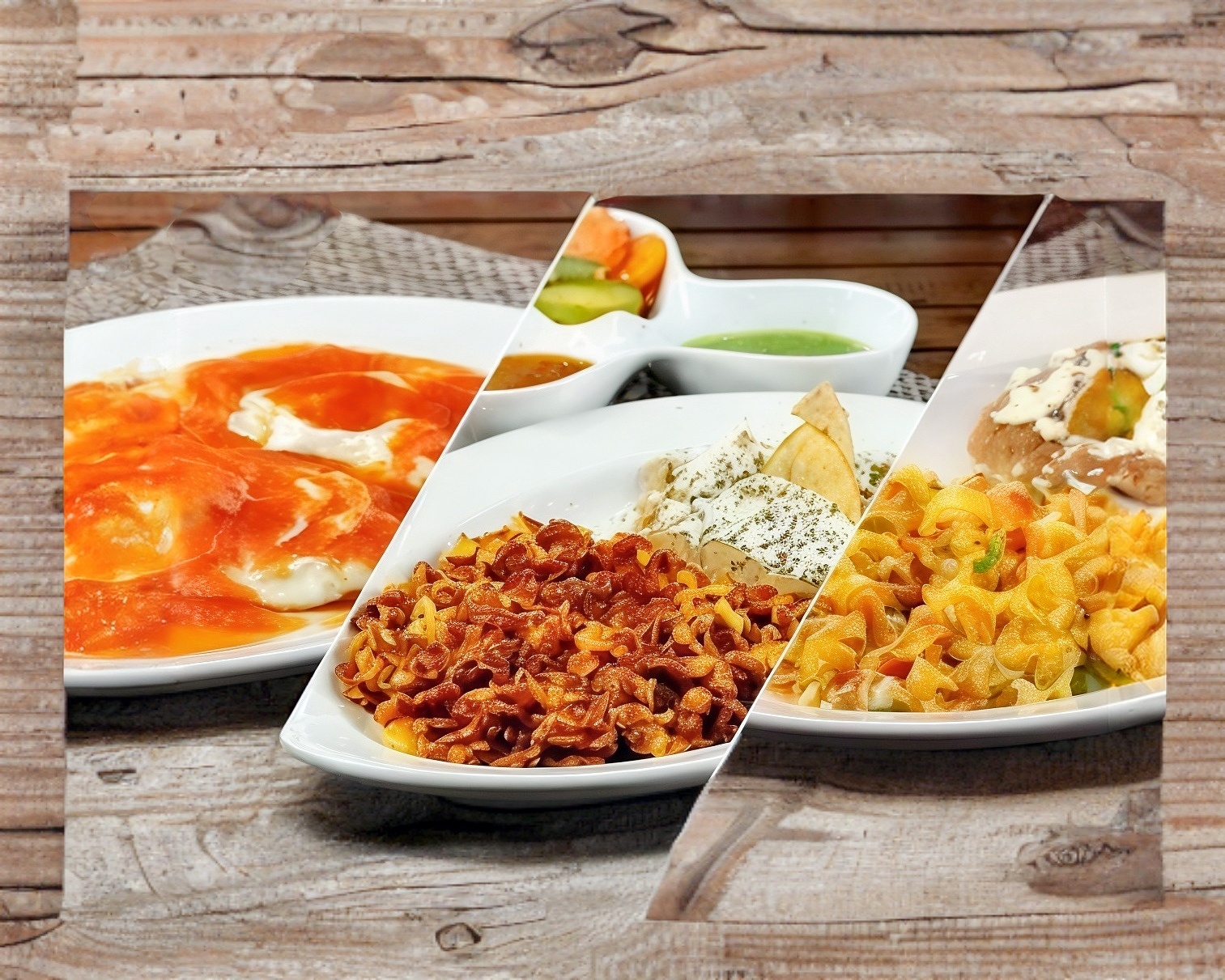 Huevo batido y cocinado con mantequilla, relleno de quesillo e ingredientes de tu elección. Acompañado con guarnición de frijoles refritos, café de olla, pan dulce y fruta con miel y granola.