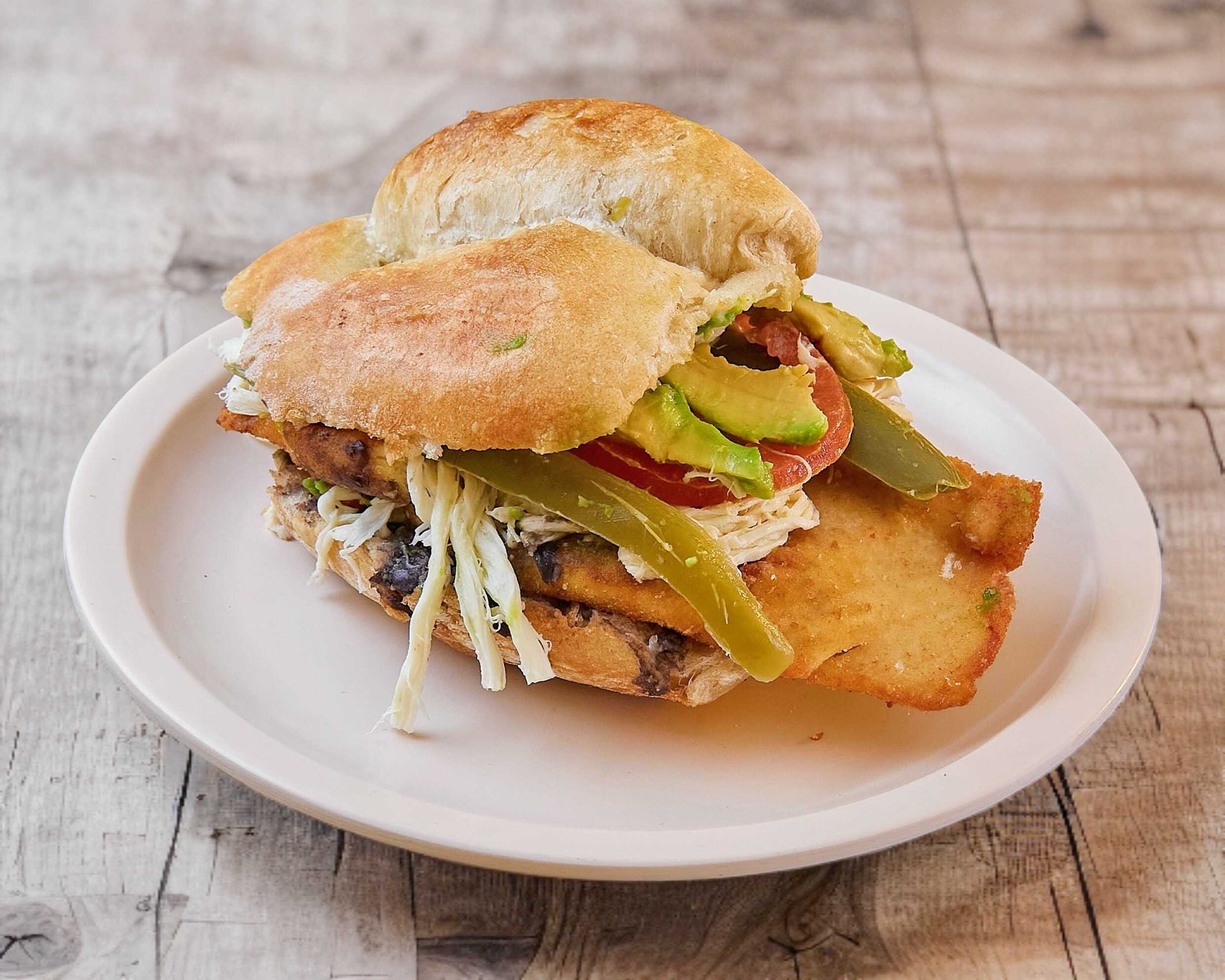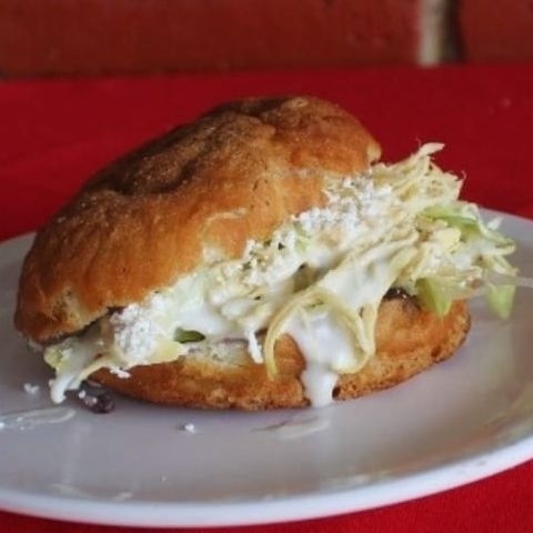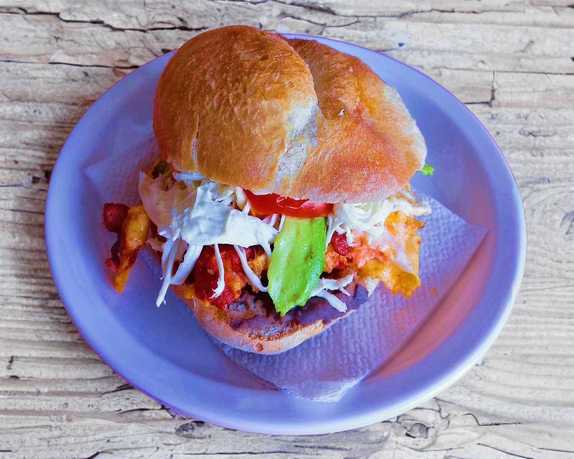 Aguacate, mayonesa, jitomate, frijoles, quesillo, cebolla y picante.
