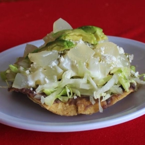 pan hecho de trigo, frito, acompañada de una capa de frijoles, carne, queso, crema, aguacate y lechuga.