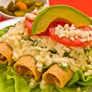 Crujientes tacos dorados, escoge tu relleno; pollo, queso, papa, carne, acompañados con lechuga, crema y queso rallado, perfectos para compartir.