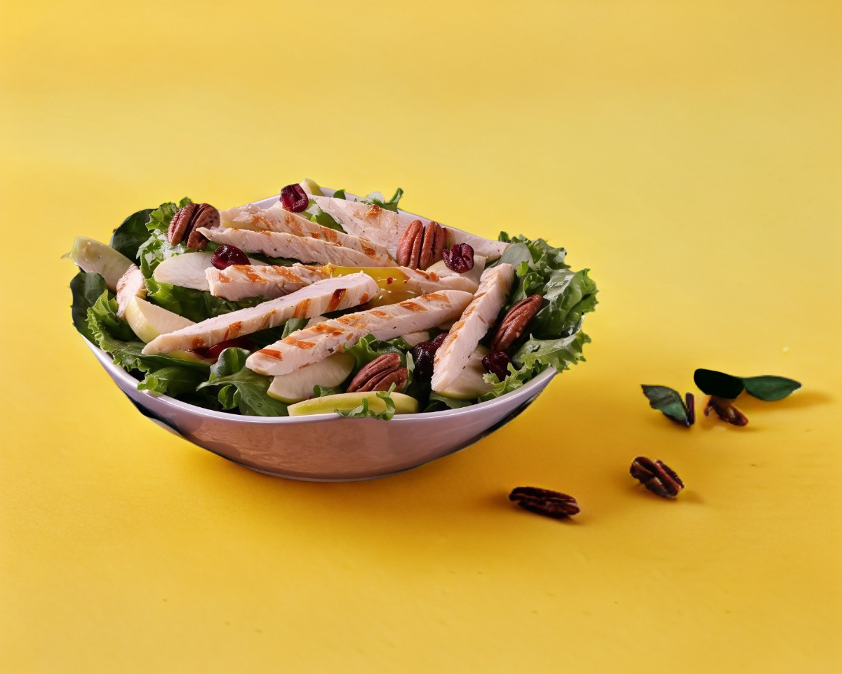 Lechuga, pollo a la plancha, ajonjolí, pasta fusilli, arándanos, manzana, nuez y aderezo miel mostaza.