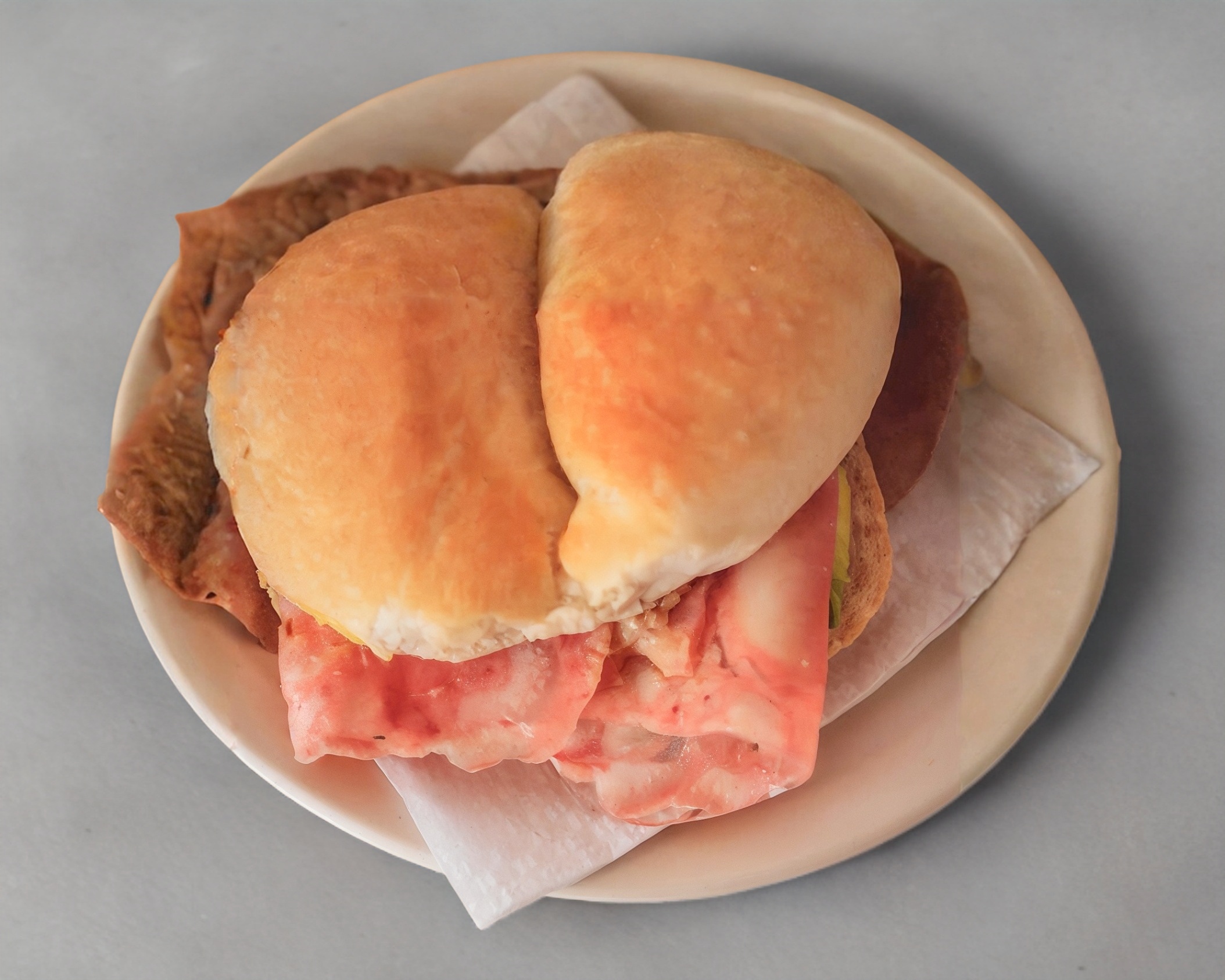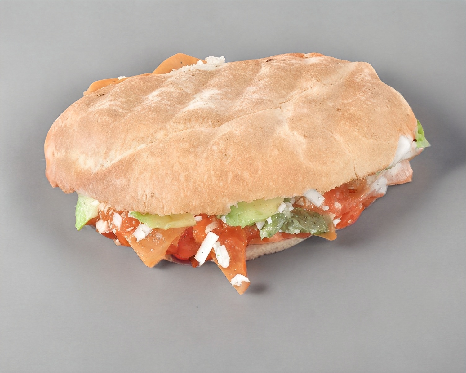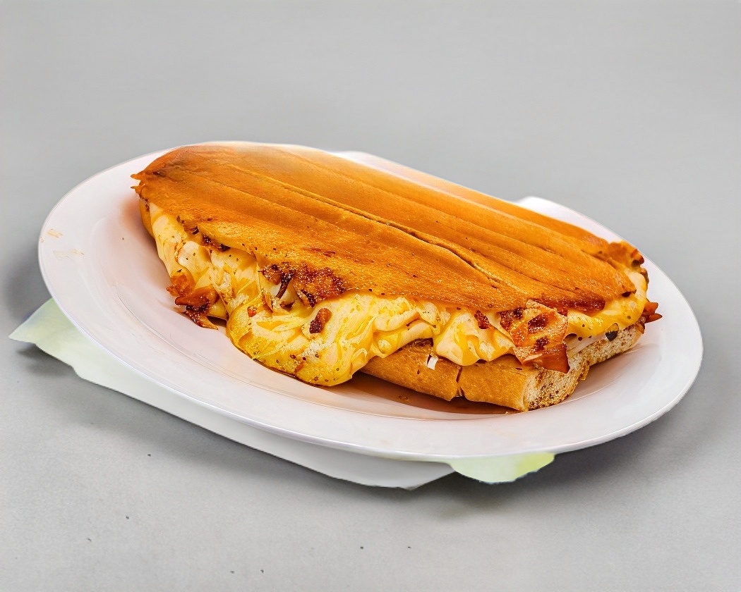 Torta con frijoles, mayonesa, aguacate, quesillo, queso Manchego y queso amarillo.