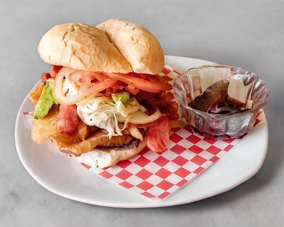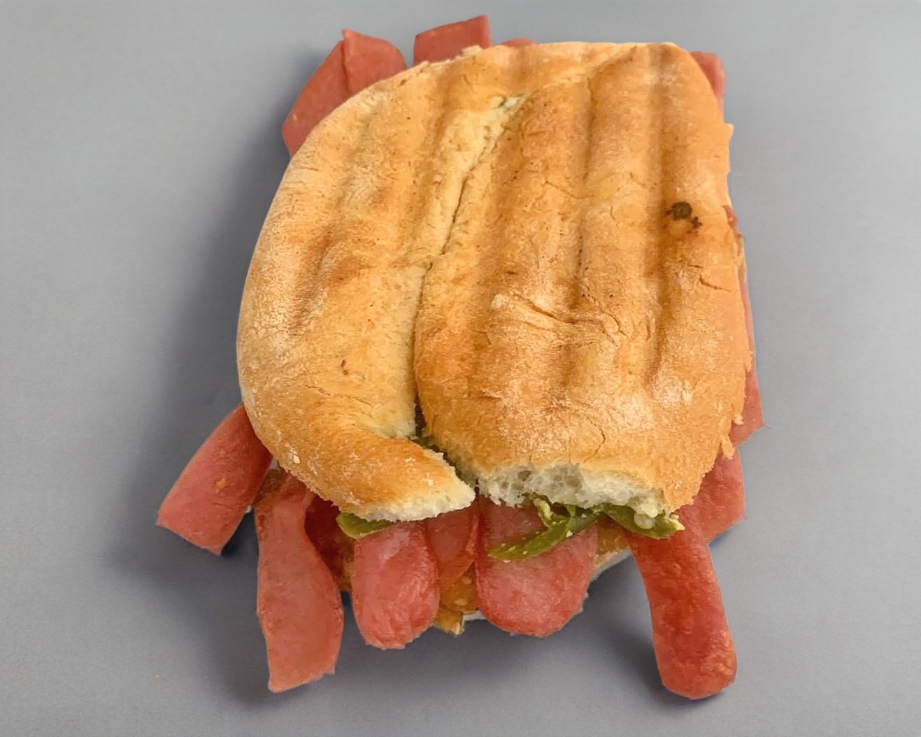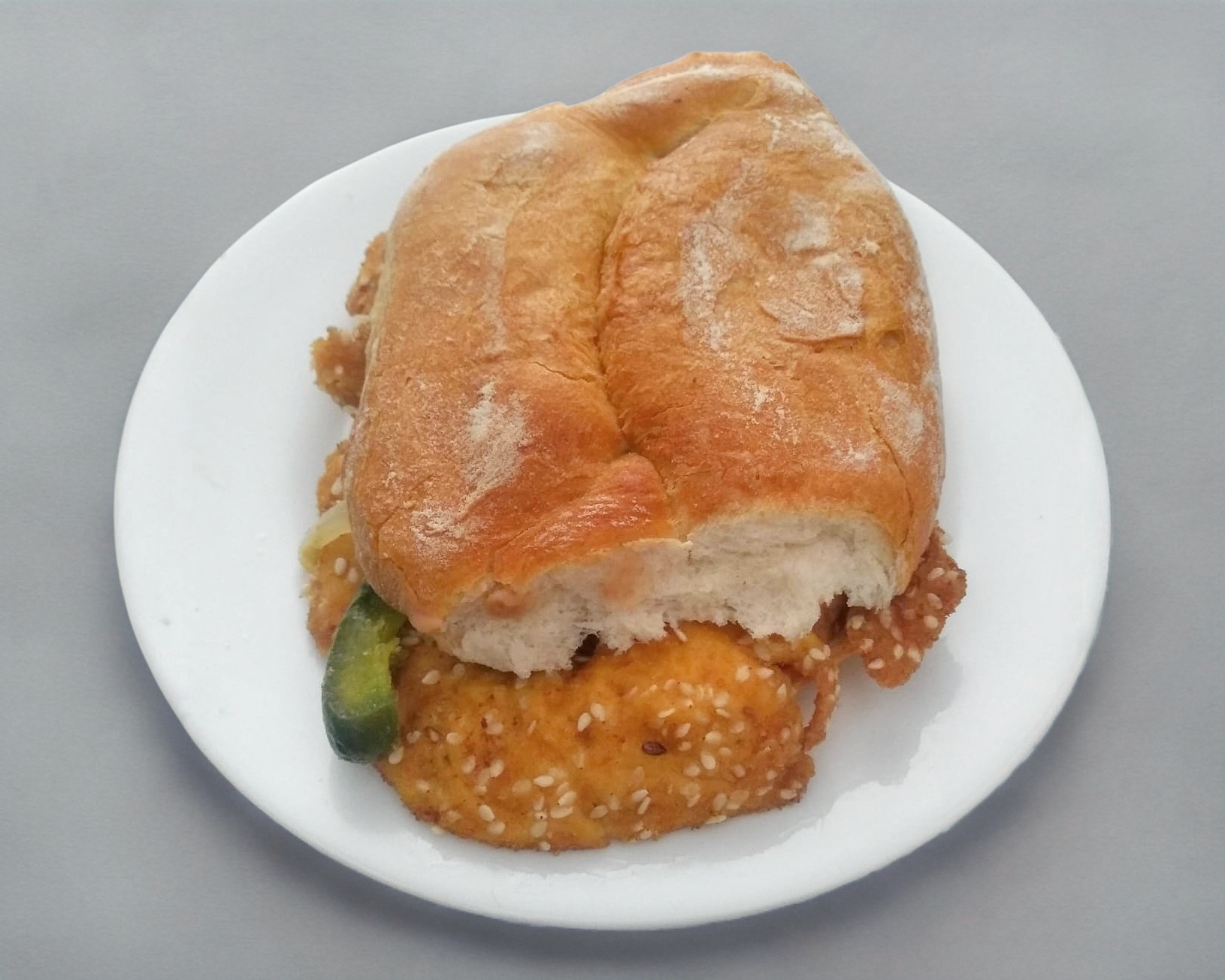 Torta con frijoles, mayonesa, aguacate, milanesa de cerdo, pierna adobada y salchicha.
