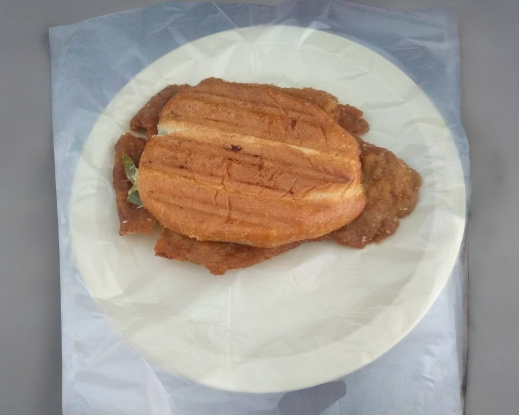 Torta de milanesa de pollo, acompañada de mayonesa, rijoles, aguacate y picante.