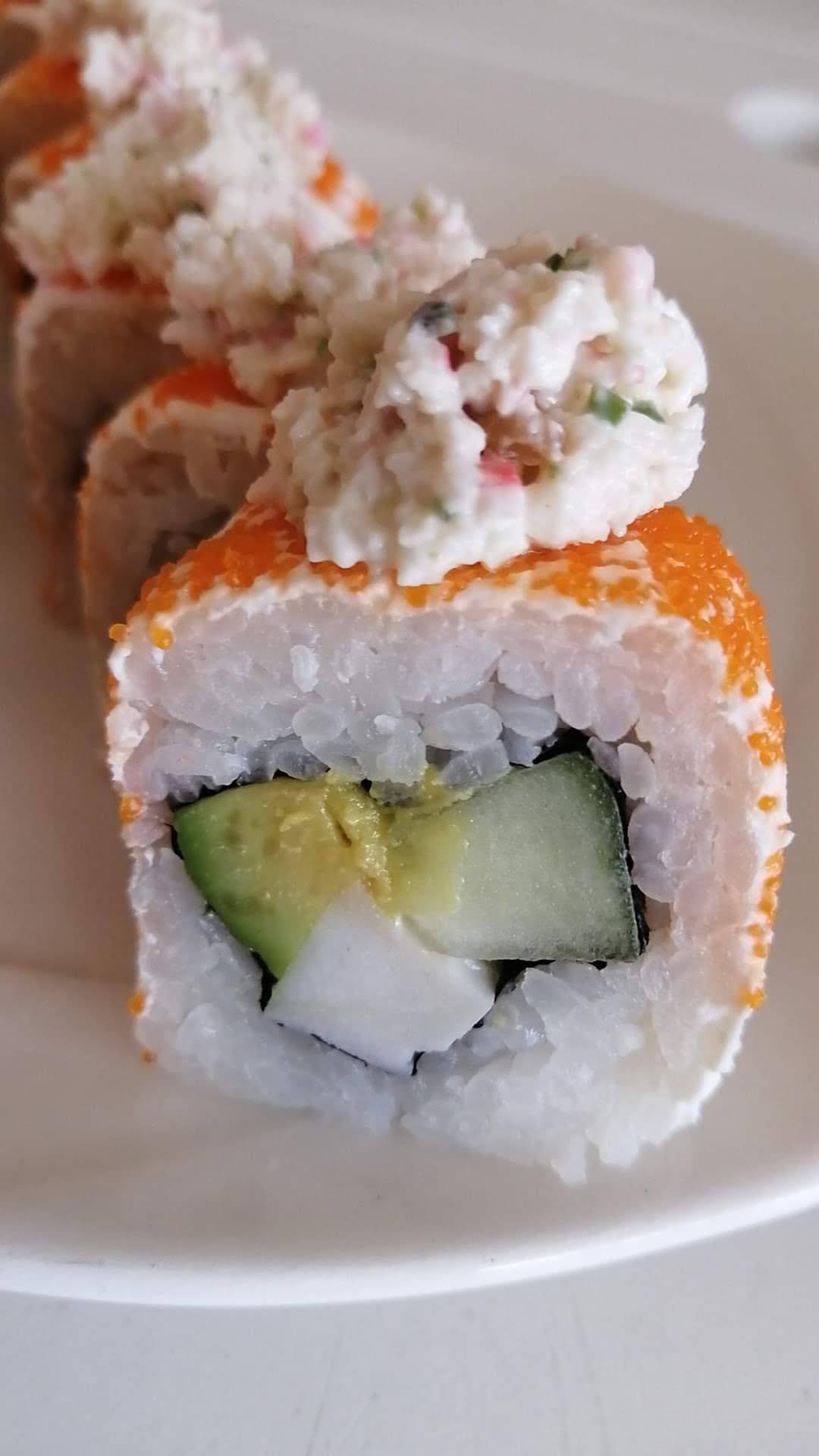 La combinación perfecta de aguacate, pepino y surimi, con queso Philadelphia, masago y aderezo tampico por fuera.