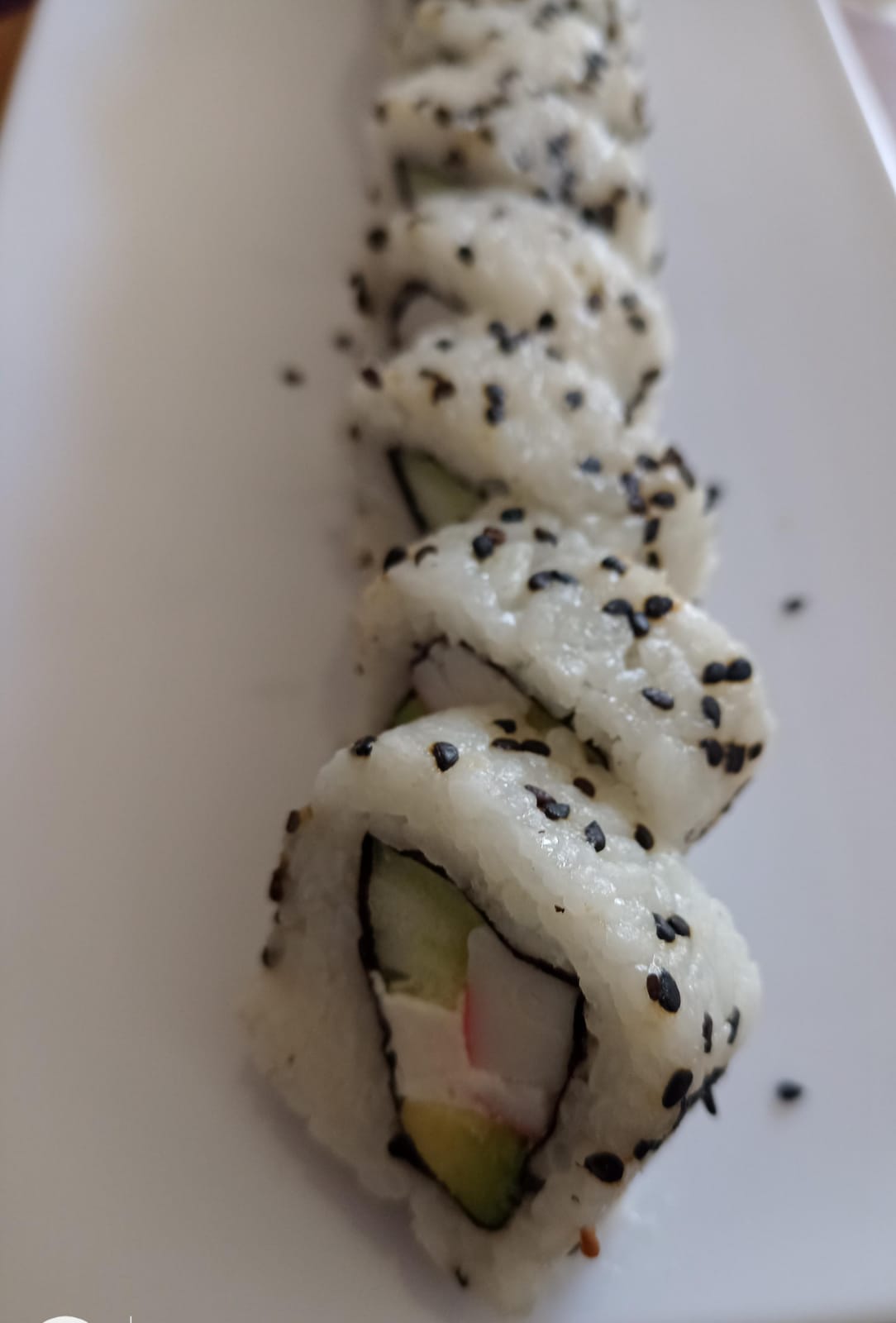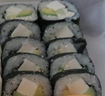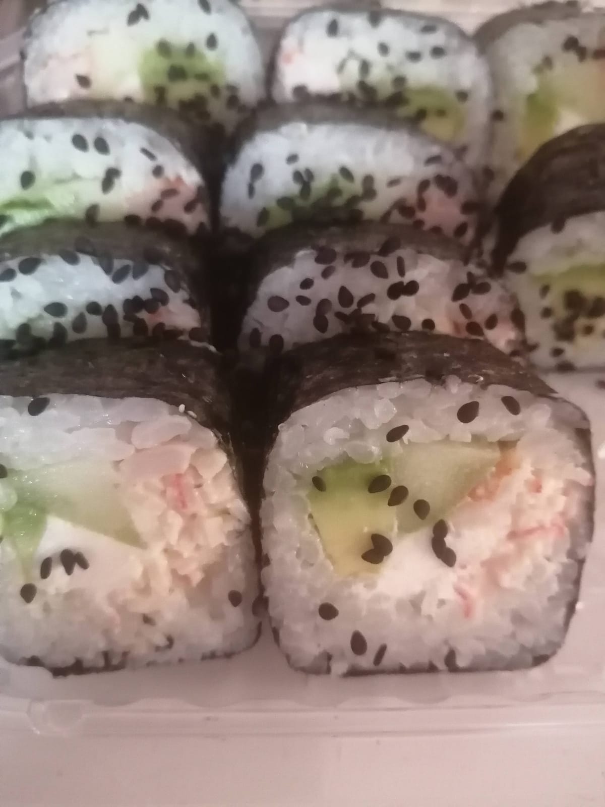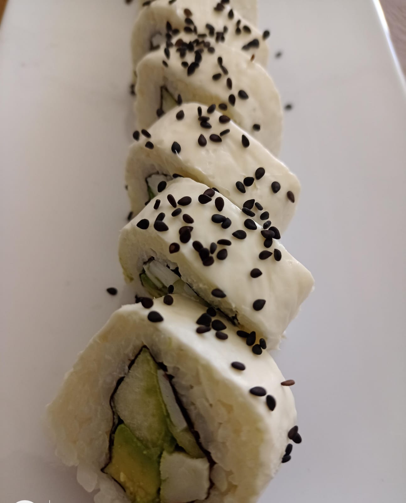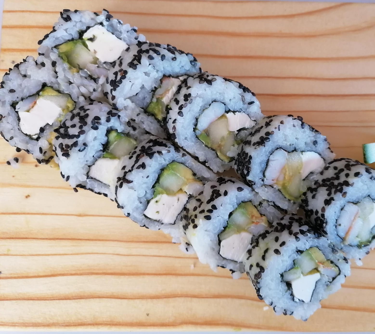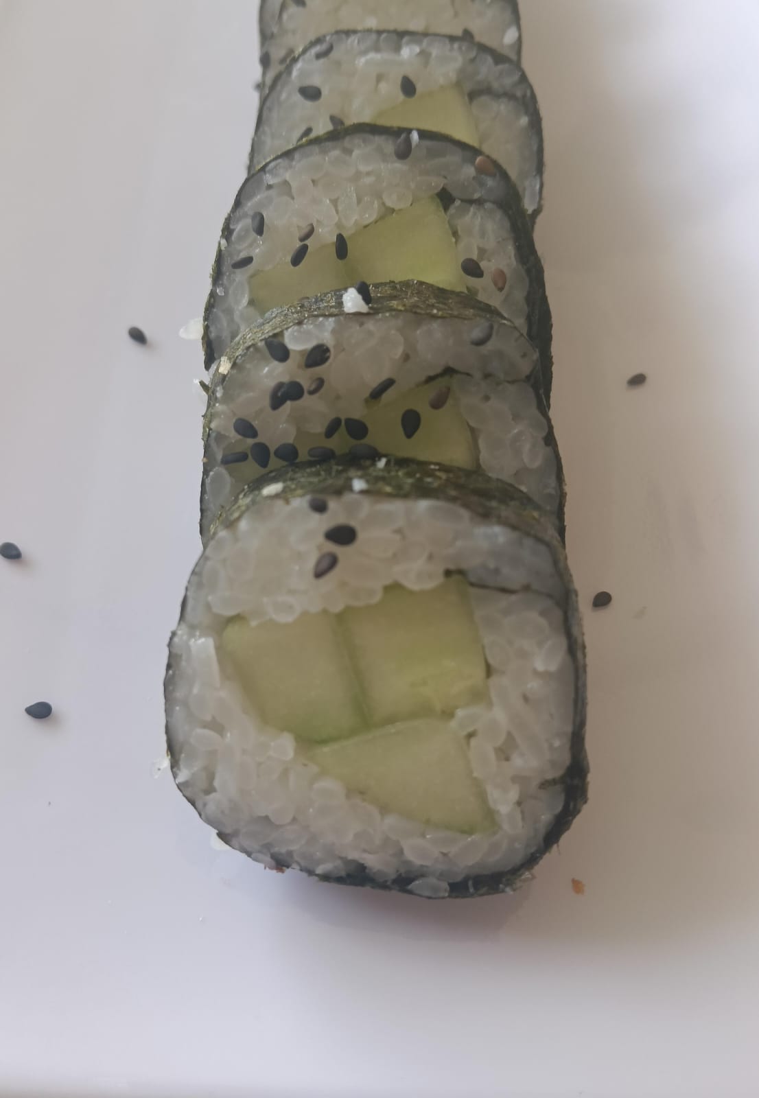 Relleno de pepino, aguacate, surimi y queso Philadelphia, envuelto en alga y ajonjolí.