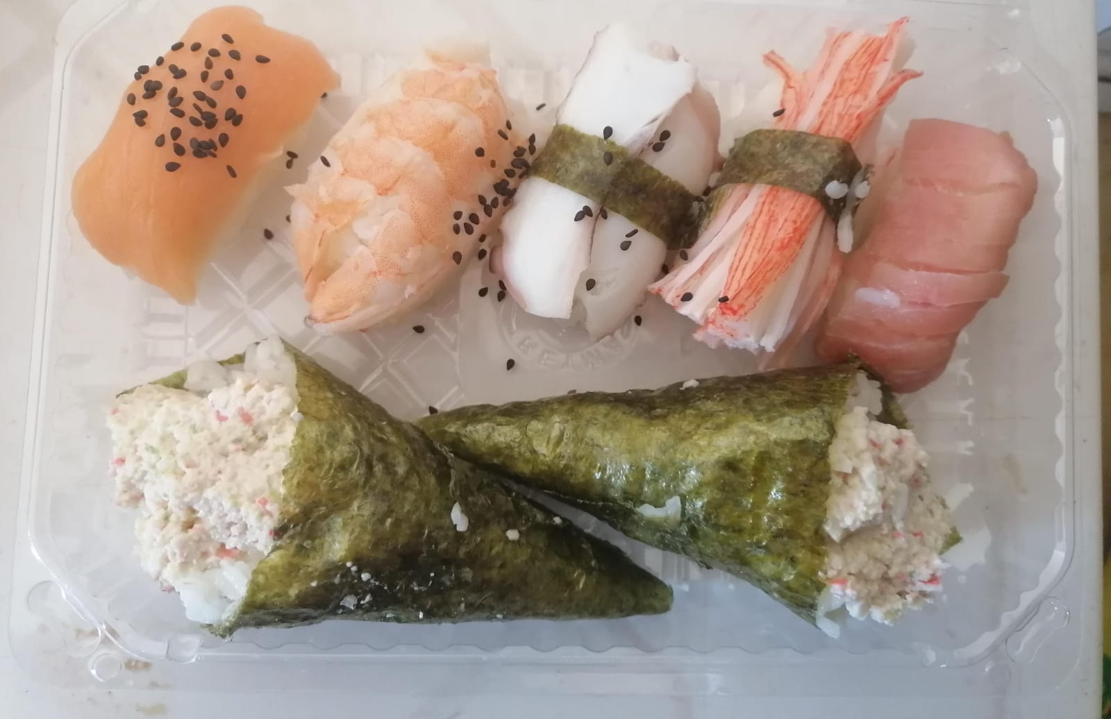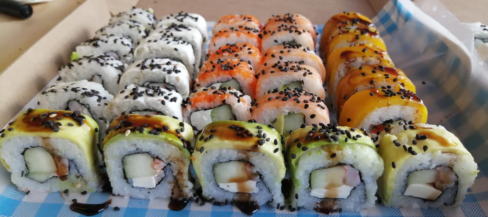 Una selección variada con 1/2 Philadelphia, 1/2 california kani, 1/2 salmón roll, 1/2 maki especial, 1/2 banana roll y 1/2 avocado.