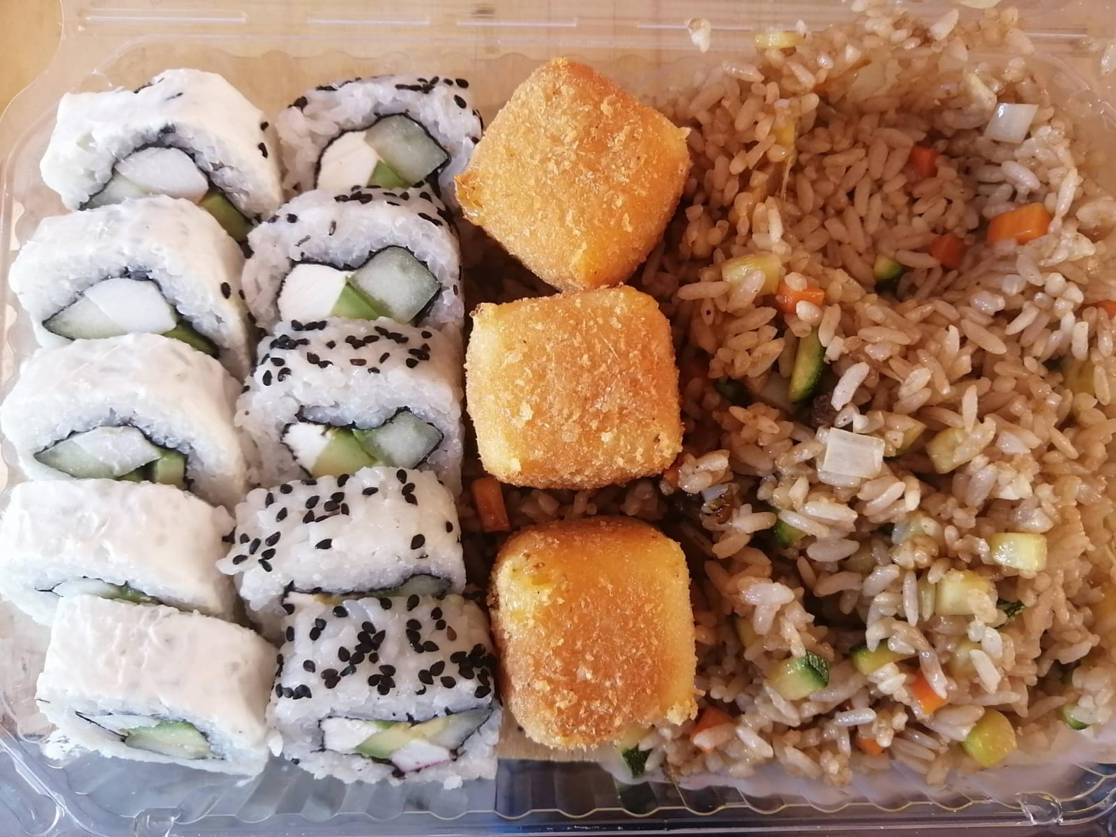 Una combinación ganadora de media orden de kushiagues de queso, yakimeshi, un rollo de Philadelphia y un rollo de california kani. ¡Todo lo que necesitas para una experiencia completa!.
