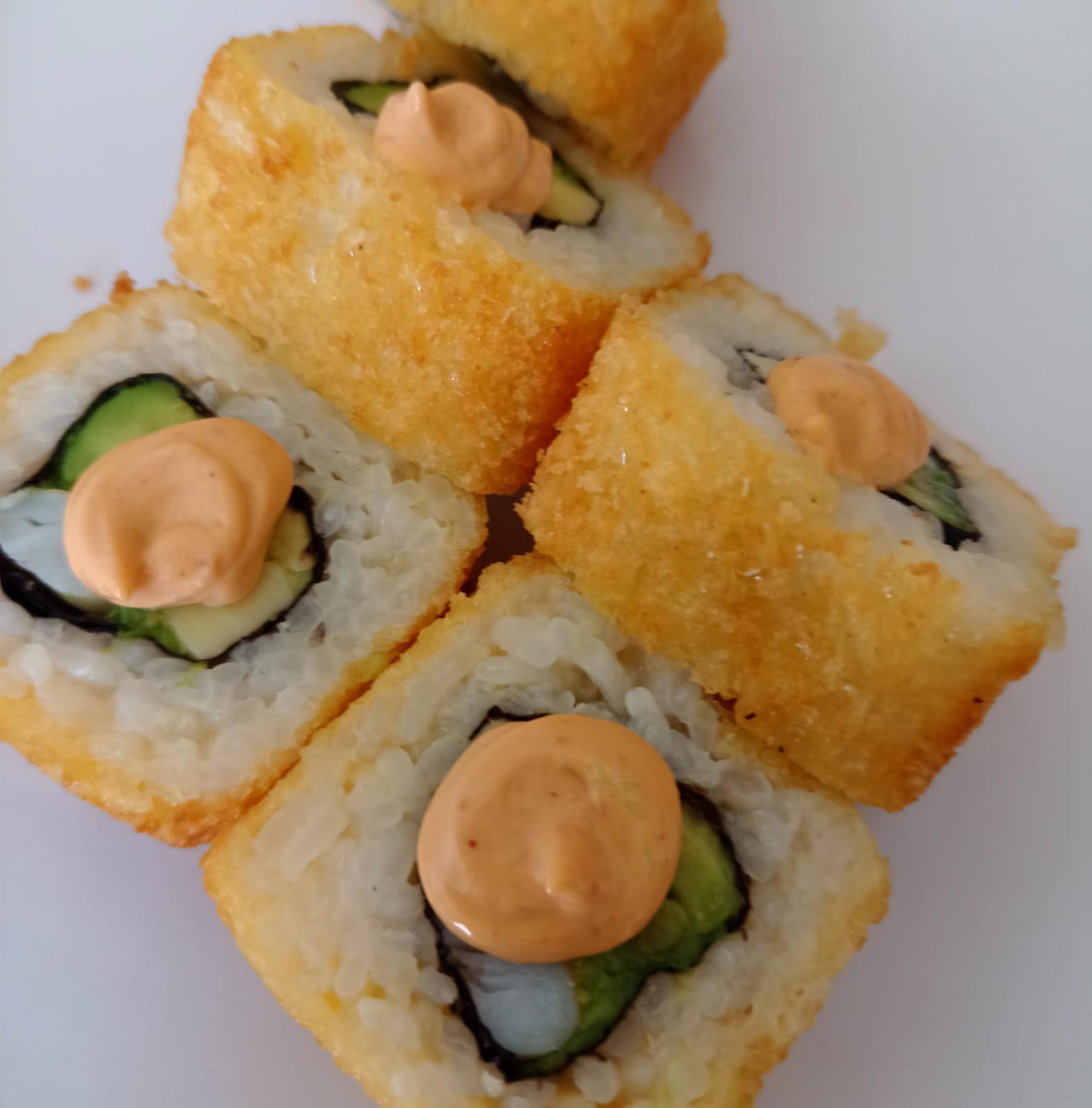 Un rollo con aguacate, pepino y camarón empanizado. Con un toque de Philadelphia, empanizado y aderezo tampico.